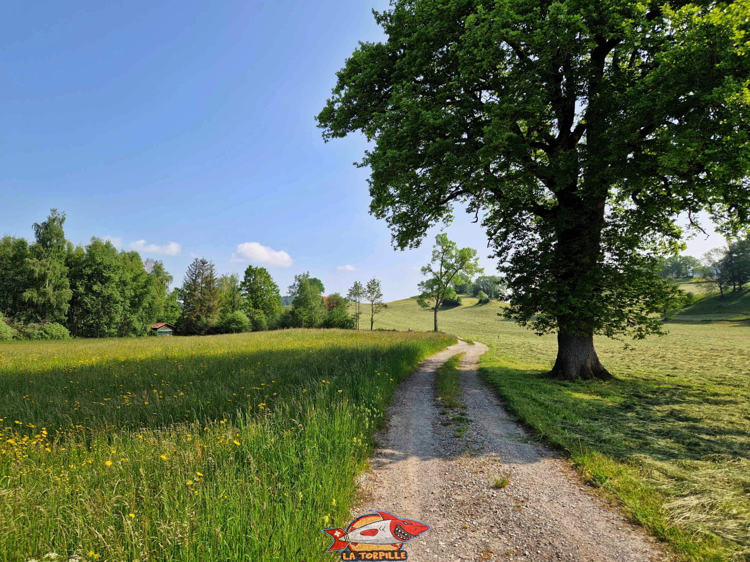 La route en gravier sur le bord sud-est du lac de Lussy.