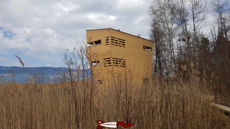 La tour d’observation de la réserve naturelle de Champs-Pittet dans la Grande Cariçaie, le plus grand marais lacustre de Suisse.