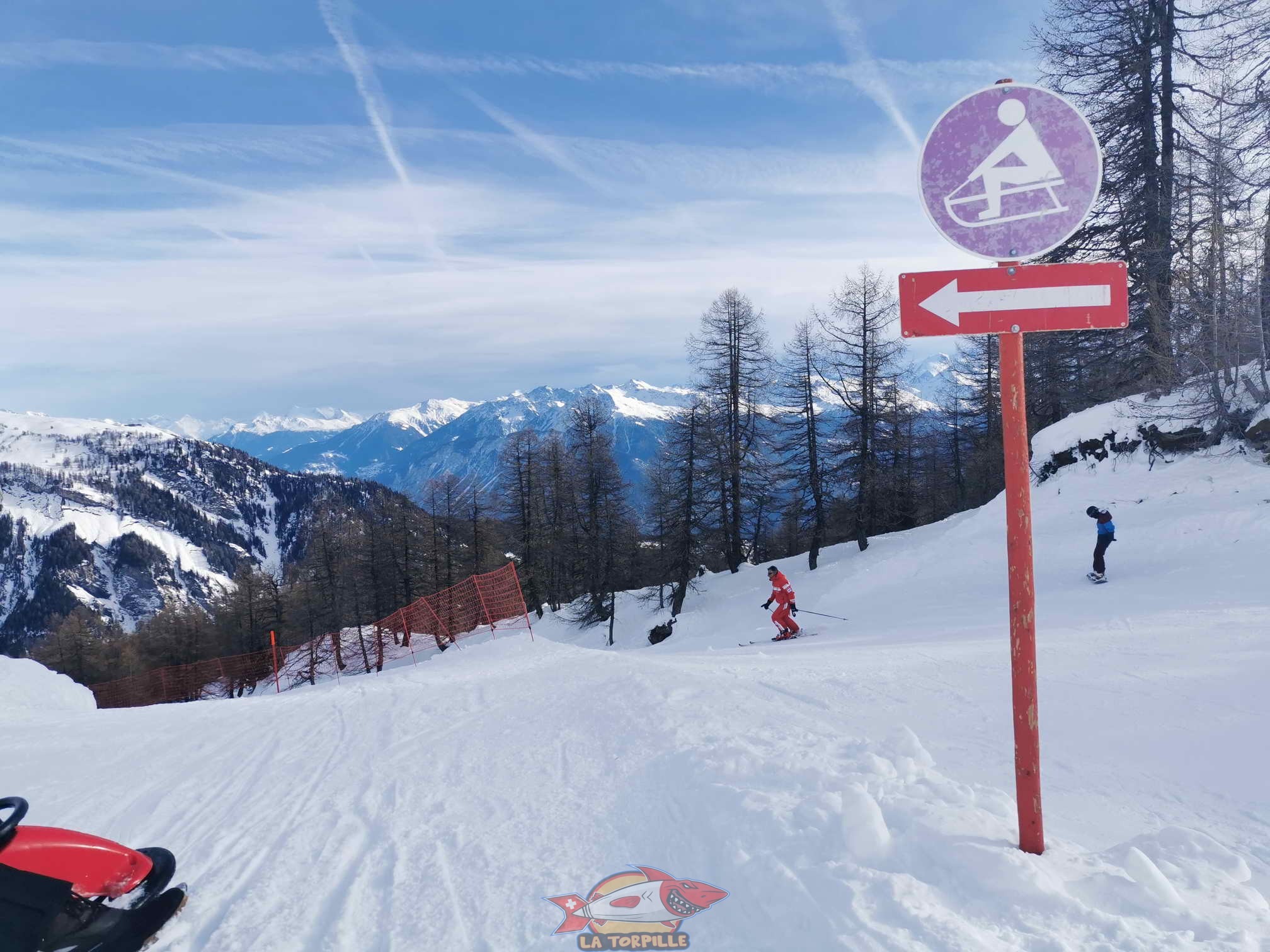 Après la première épingle, on suit le marquage violet qui indique le chemin de la piste de luge. Sur la droite, un panneau indique que la piste est réservée aux lugeurs.