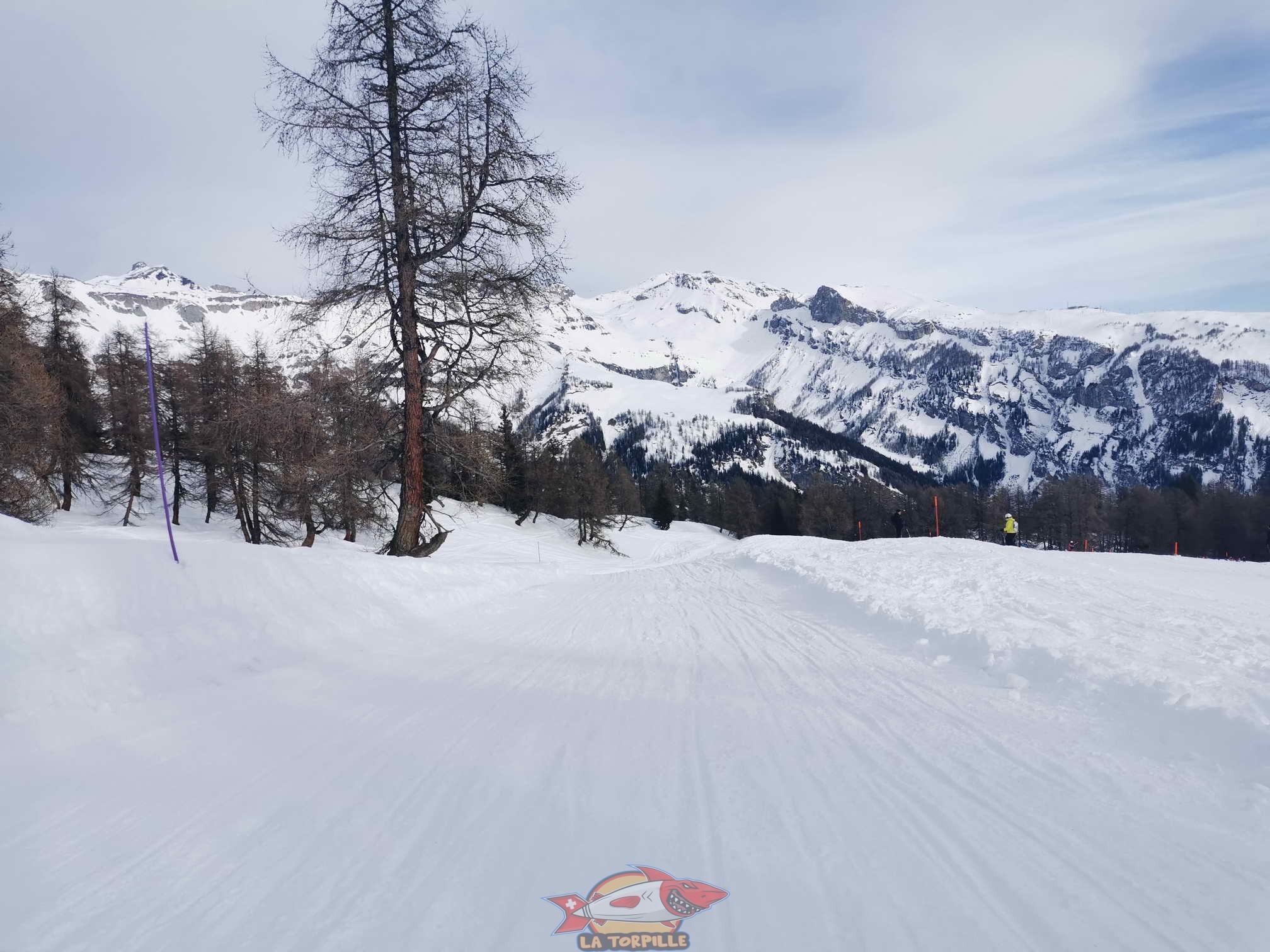 La partie supérieure de la piste, et surtout, le télésiège, permettent de profiter d’une magnifique vue sur le versant sud de la vallée du Rhône ainsi que le massif du Mont-Blanc.