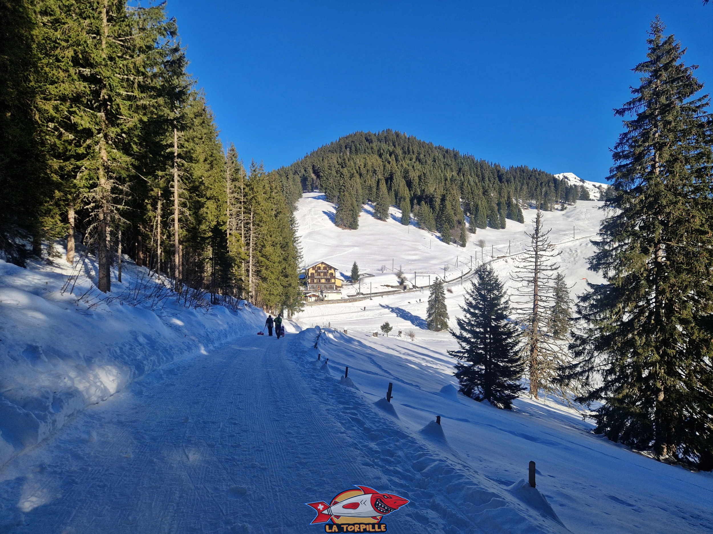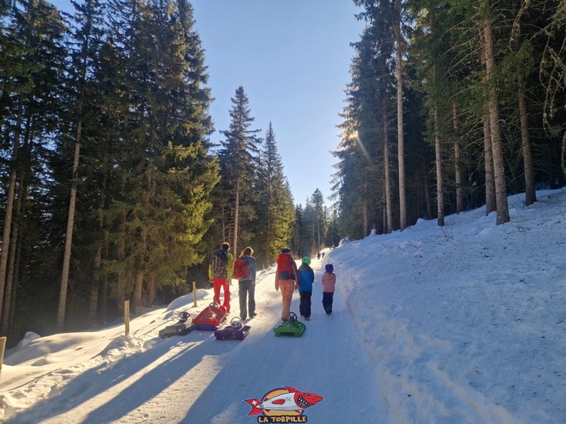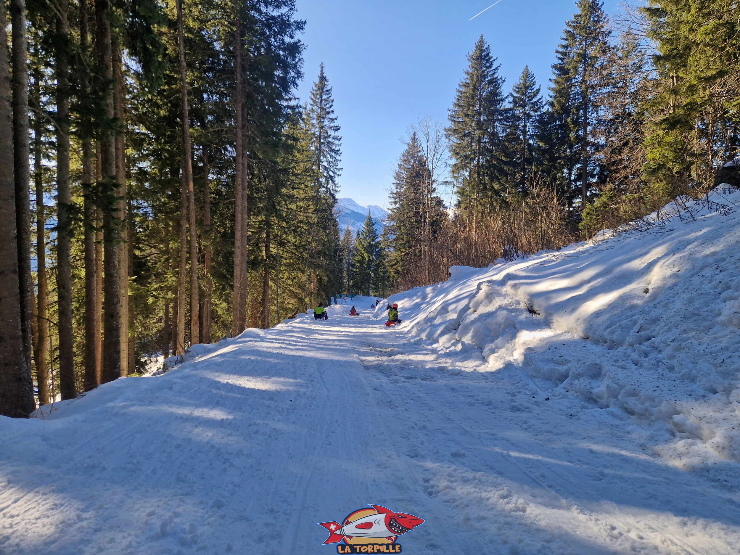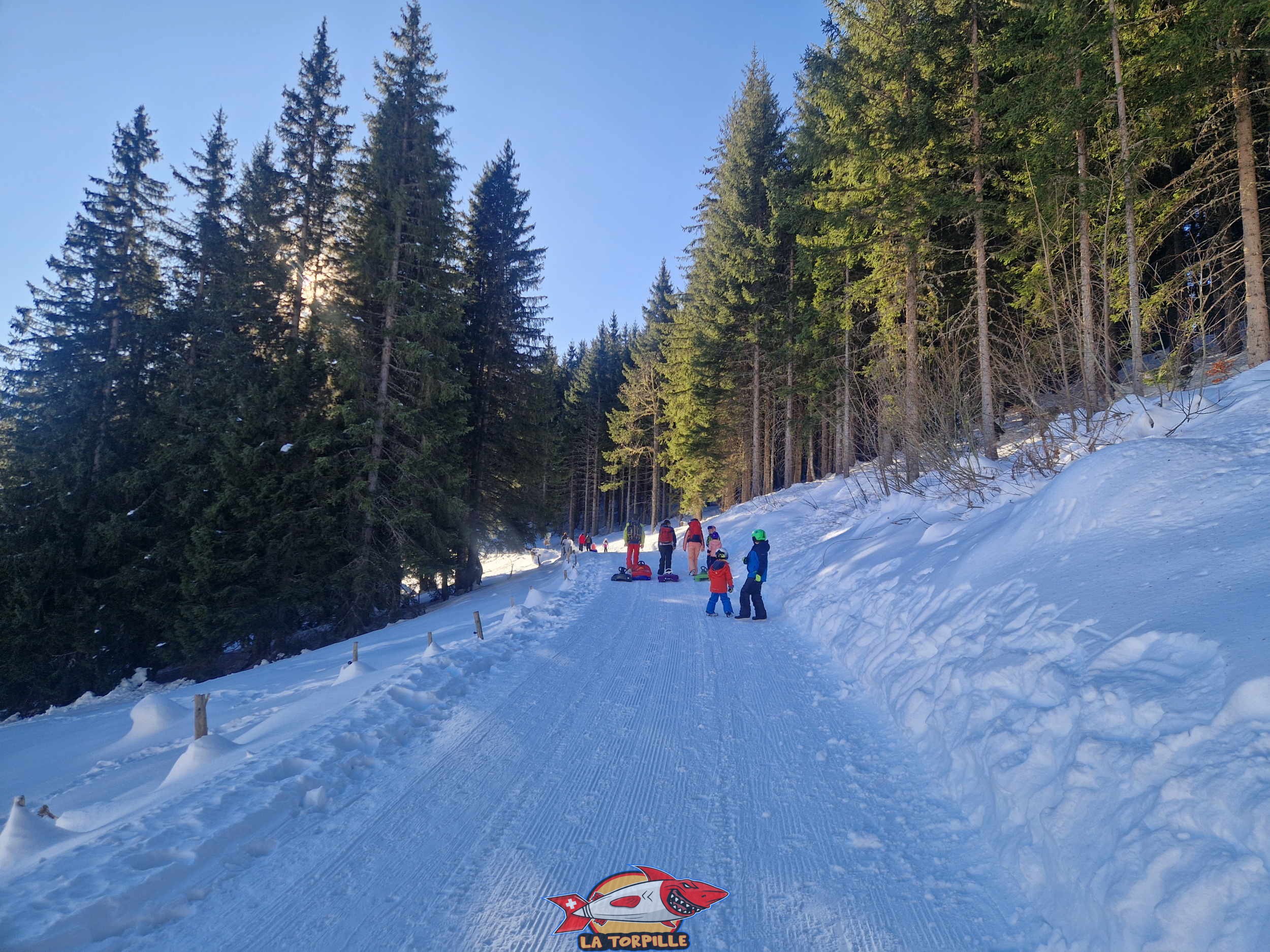Depuis la gare BVB du col-de-Soud, il faut tirer sa luge sur environ 400 mètres en légère montée.