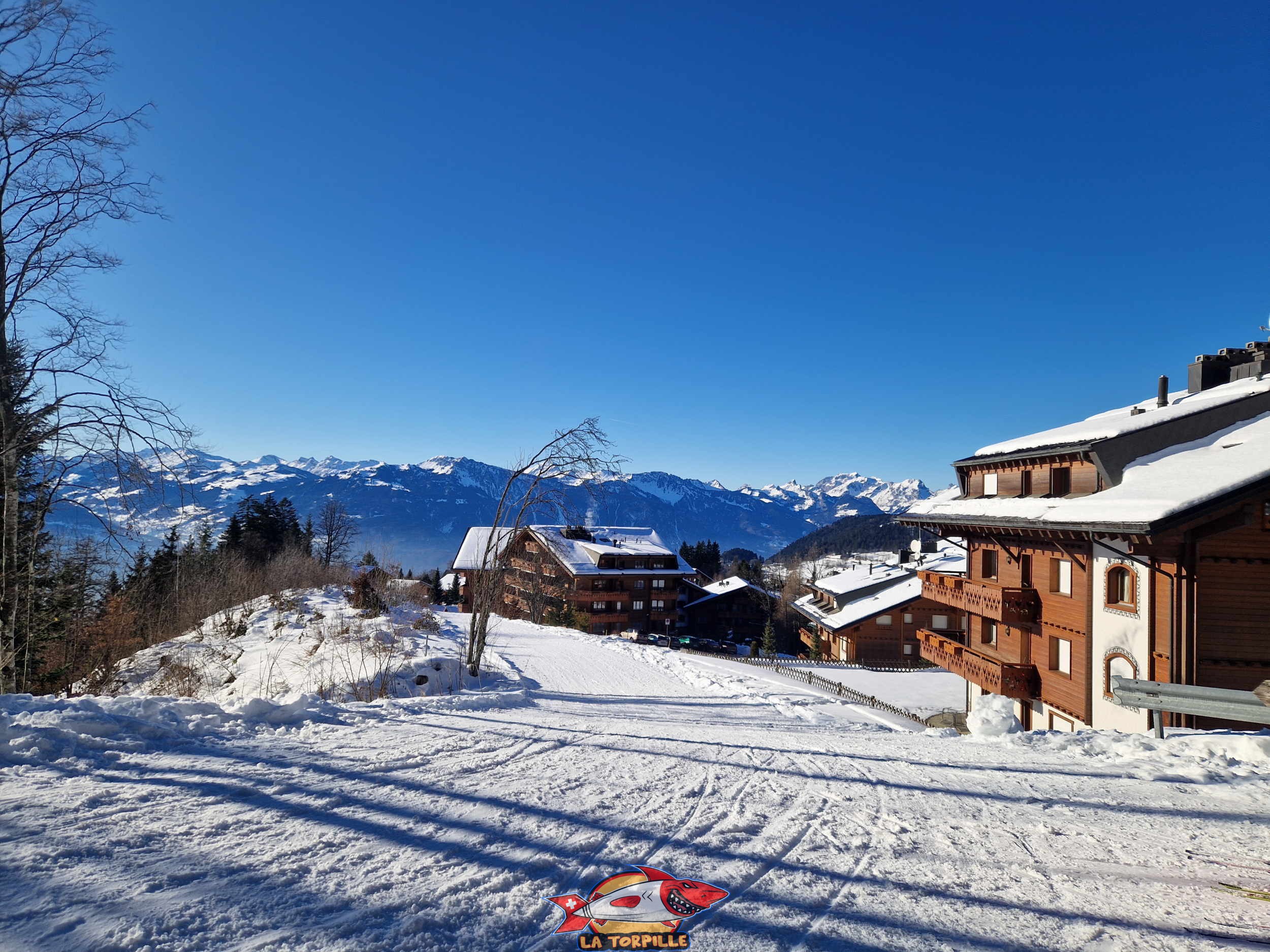 Le passage à côté des grands chalets de Villars. Tout en arrière-plan, la gare de Roches Grises.