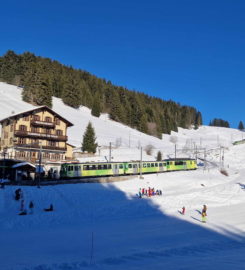 La station de Villars-sur-Ollon dans les Alpes vaudoises propose une courte mais sympathique piste de luge entre les arrêts du train à crémaillère Col de Soud et Roches Grises.