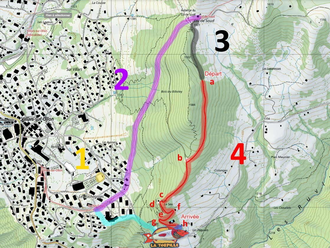 La carte Swiss Topo de la piste de luge de Villars avec train.