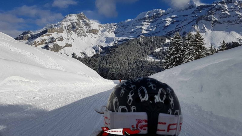 La piste de luge proche de la station des Diablerets que l’on voit sur la gauche. Sur la droite, le Sex Rouge et sa fameuse passerelle “Peak Walk” de Glacier 3000.