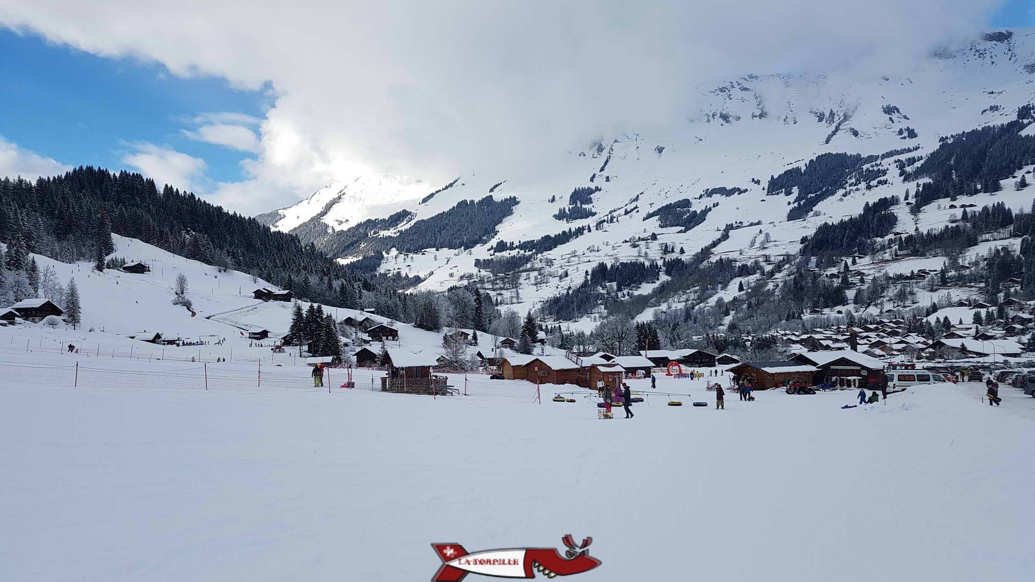 La piste de luge avec le massif des Diablerets. Sur la gauche, le restaurant des Mazots.