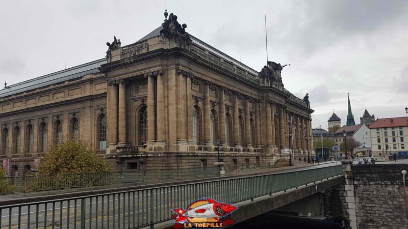 Le bâtiment hébergeant le musée d’art et d’histoire avec, en arrière-plan, la cathédrale de Genève avec ses deux tours et sa flèche verte.