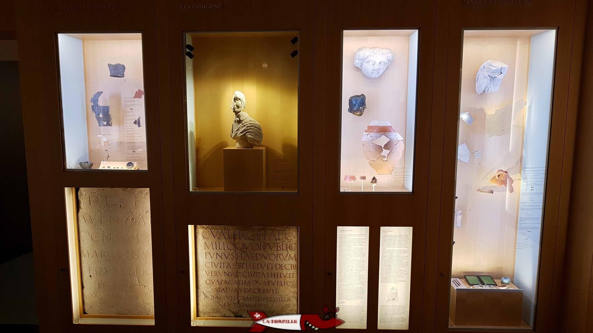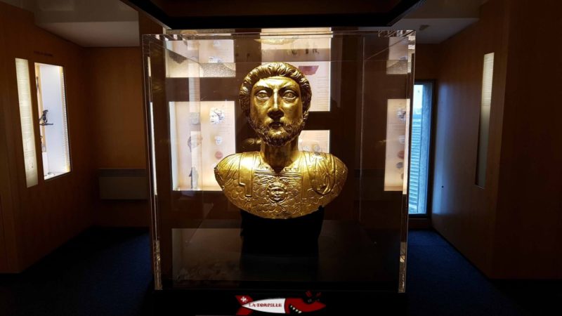 Le fameux buste de Marc-Aurèle, empereur romain de 161 à 180. D’un poids de 1.6 kilo d’or 22 carats (environ 92 % d’or), c’est l’objet archéologique le plus précieux découvert en Suisse et, évidemment, l’objet phare du musée. C’est l’un des trois bustes en or d’empereurs romains existants encore aujourd’hui. L’objet exposé est une copie de l’original qui se trouve dans un safe de la BCV et qui n’y est ressorti pour être présenté au public que deux fois depuis sa découverte. Certains chercheurs indiquent que le buste pourrait plutôt être celui de l’empereur gaulois Tétricus I, qui régna de 271 à 274.