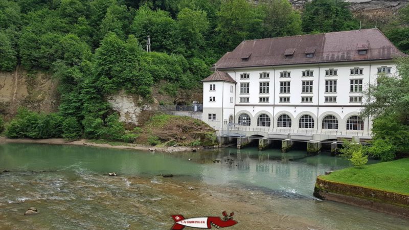 Le café-théâtre et musée de la marionnette avec, sur la droite, l’usine hydroélectrique de l’Oelberg. À l’extrémité gauche, la tour de Dürrenbühl, à l’extrémité droite, la tour de Bourguillon.