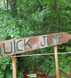 La zone de départ du Parc Aventure avec un panneau indiquant la direction à suivre pour rejoindre le Quick-Jump.
