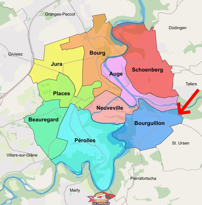 Les quartiers de la ville de Fribourg. Le parcours vita se trouve dans le quartier de Bourguillon (flèche rouge). Photo : Wikimedia Commons.