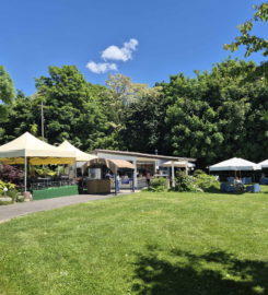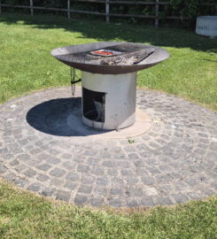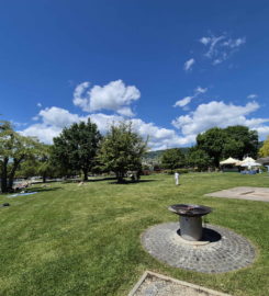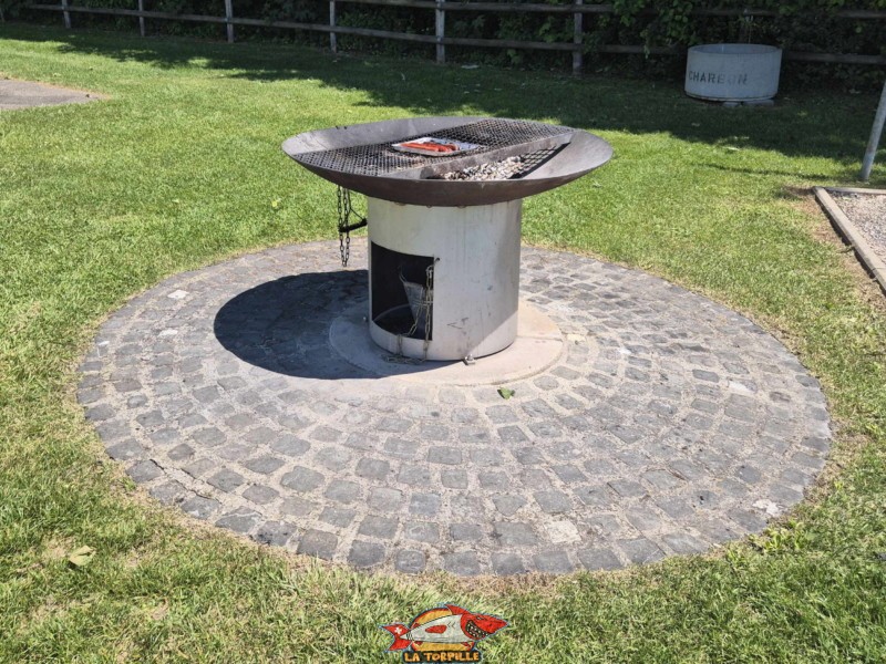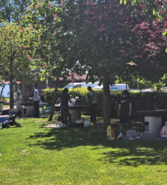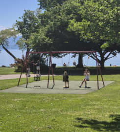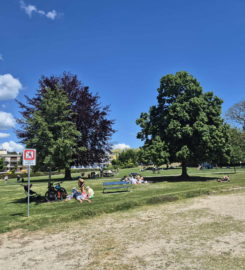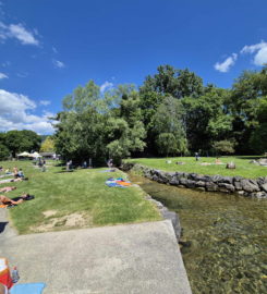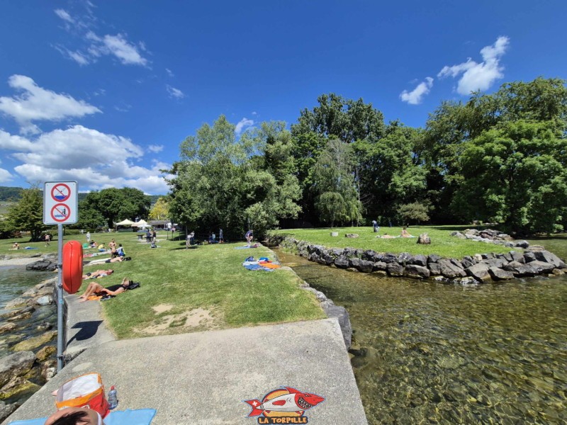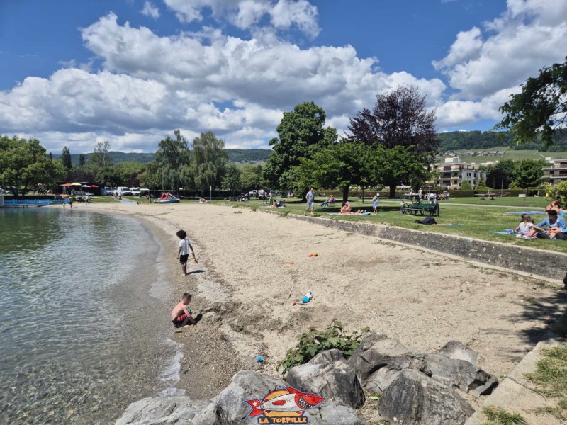 Elle possède une zone de baignade en sable, une grande pelouse et une buvette.