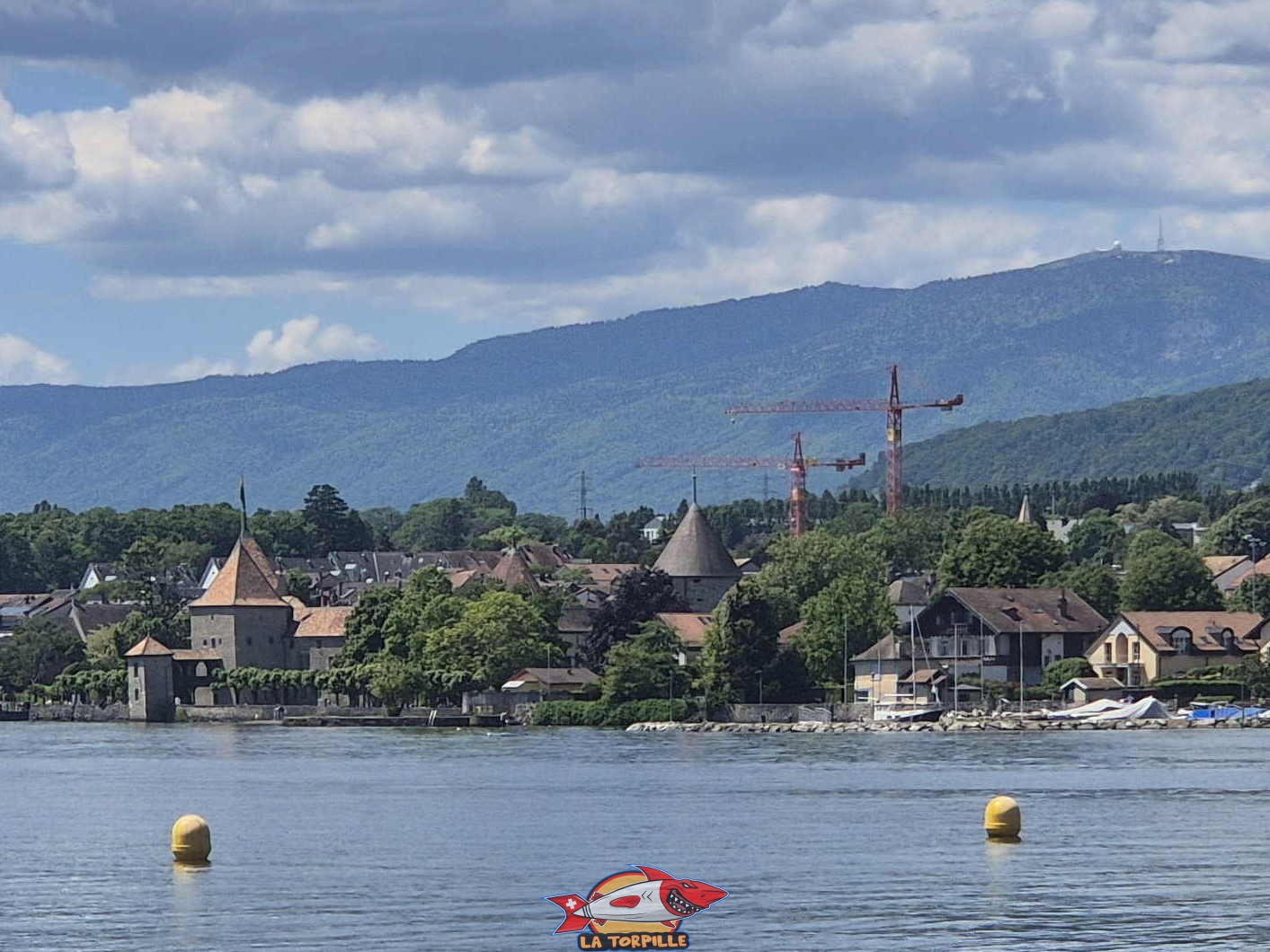 La vue sur le château de Rolle depuis la plage de Rolle. En haut, à droite, La Dôle.
