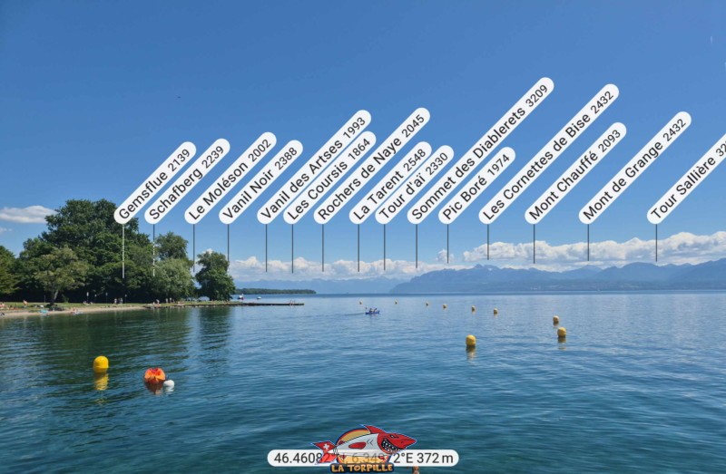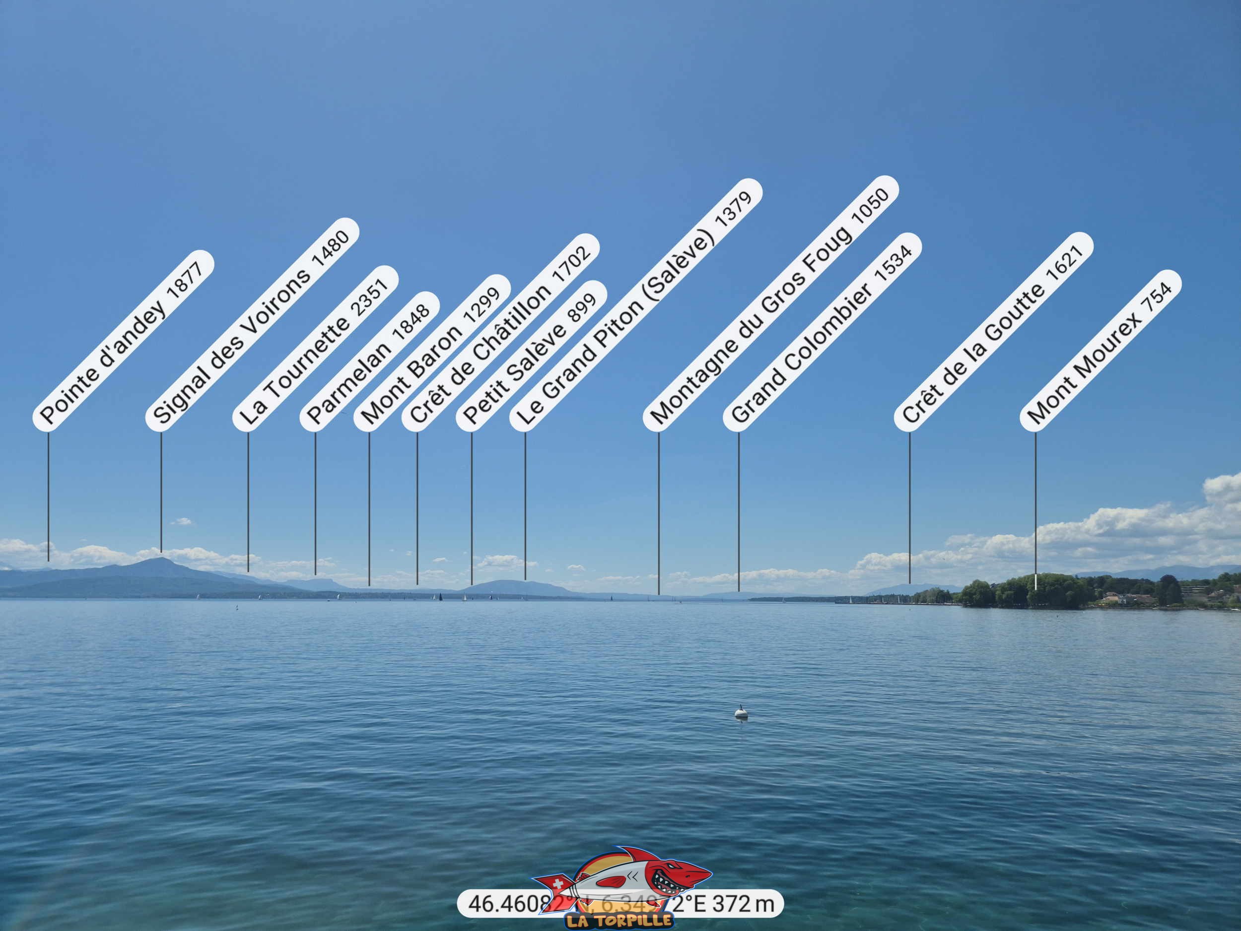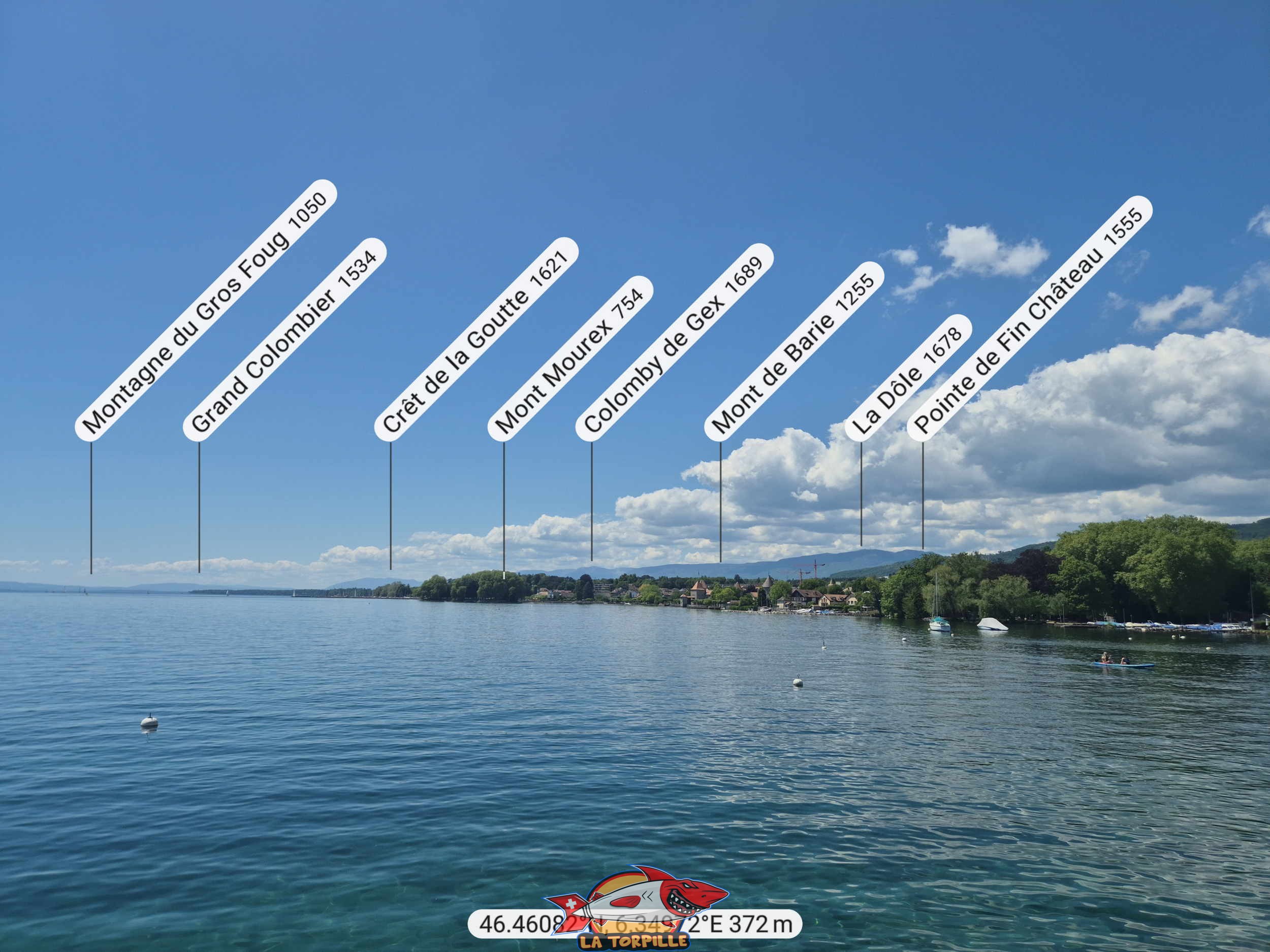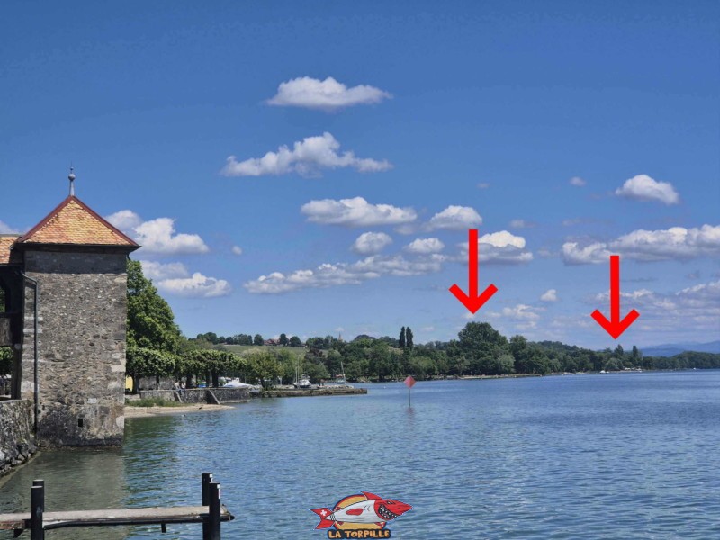 La vue depuis le château de Rolle direction nord-est. La flèche gauche est à hauteur de la plage de Rolle et celle de droite à hauteur de la plage du Plongeon.
