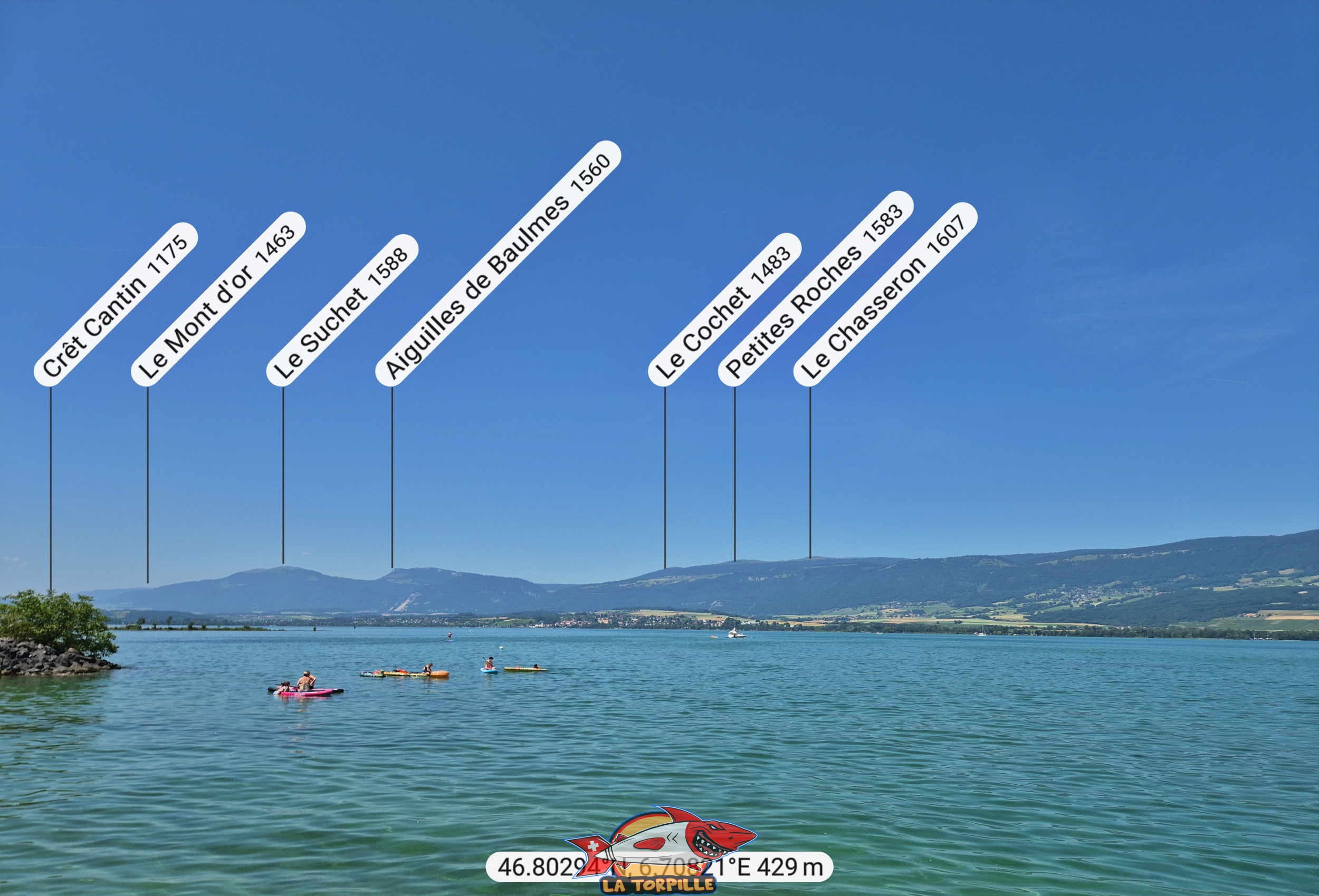 La vue, direction ouest, depuis la plage de Châble-Perron. Les Aiguilles de Baulmes, le Chasseron.