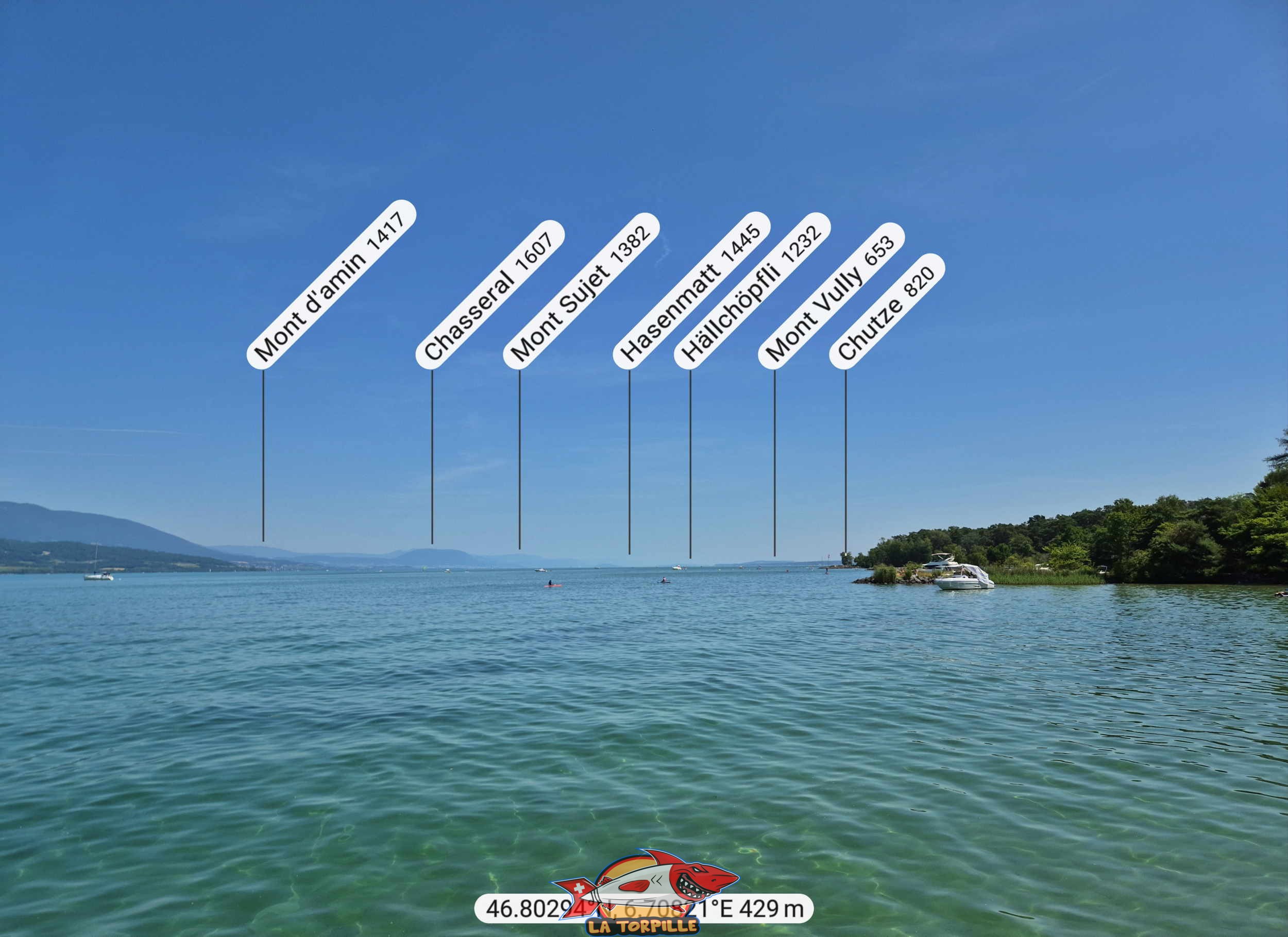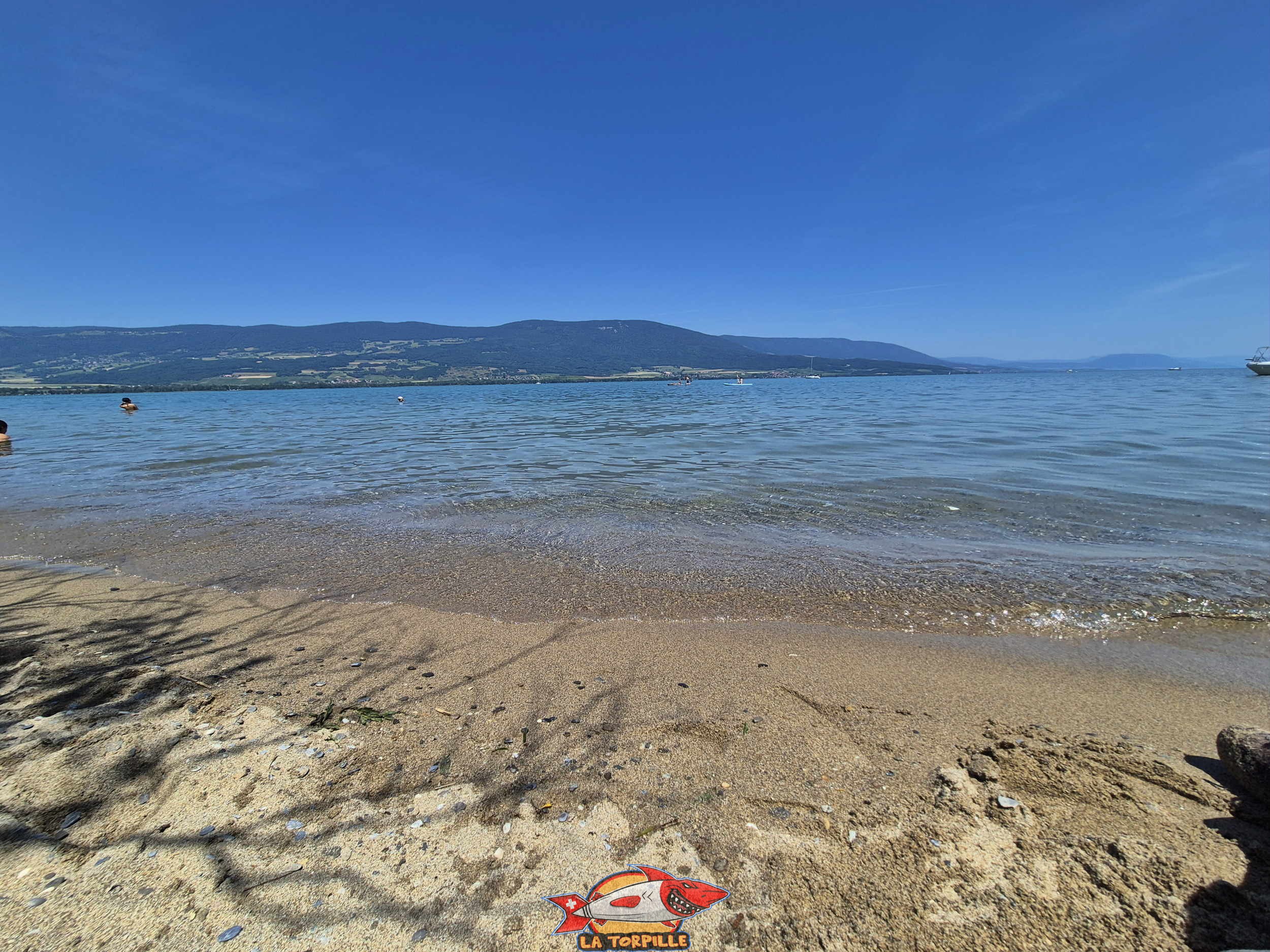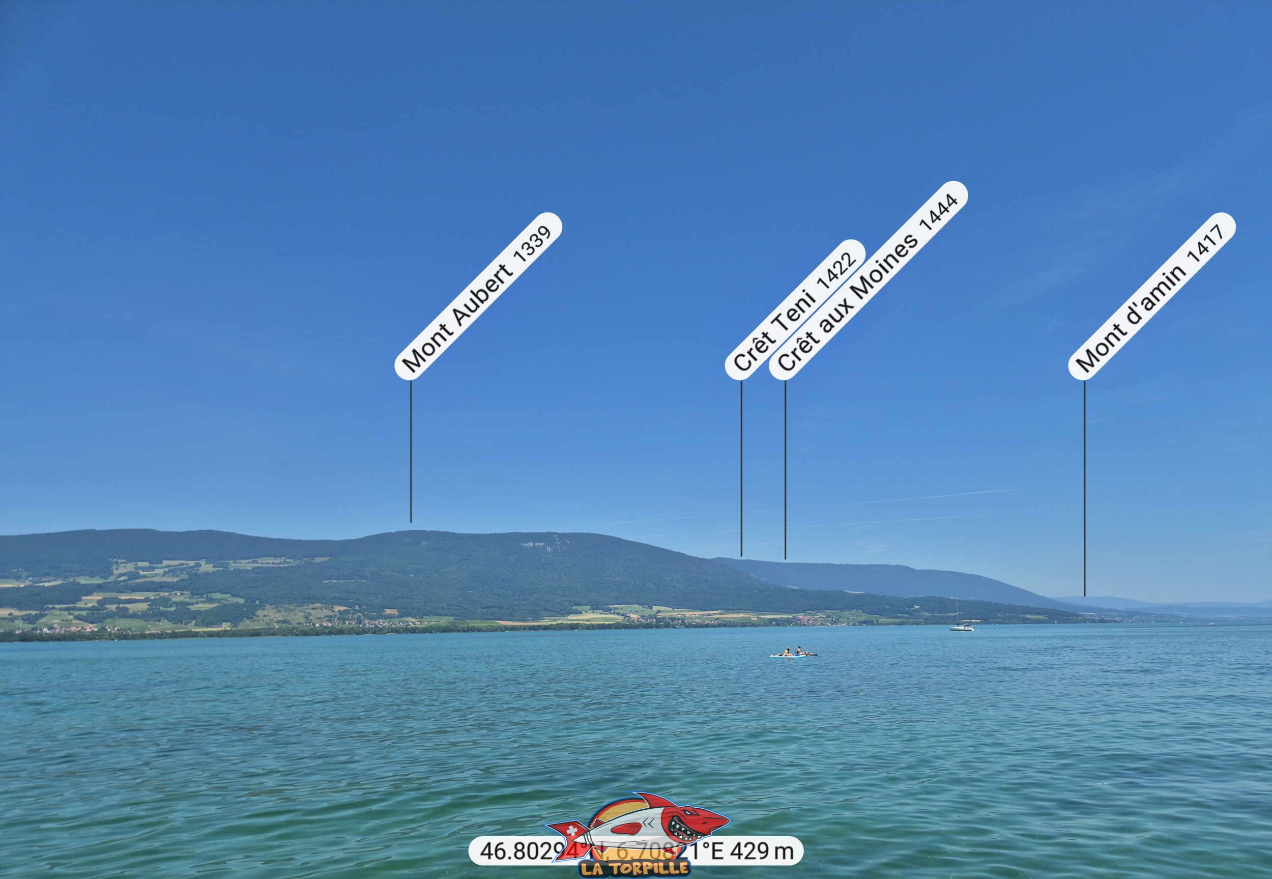 La vue, direction nord-est, depuis la plage de Châble-Perron. Le Chasseral, le Mont Sujet, le Mont Vully.