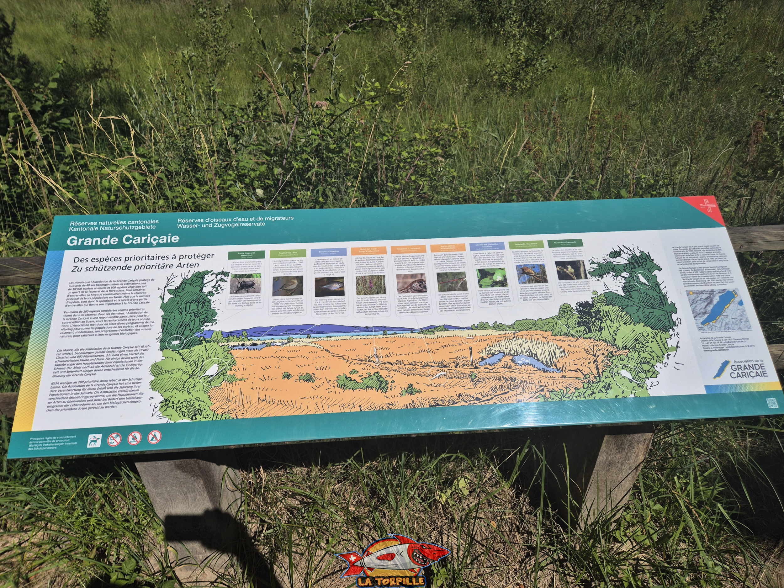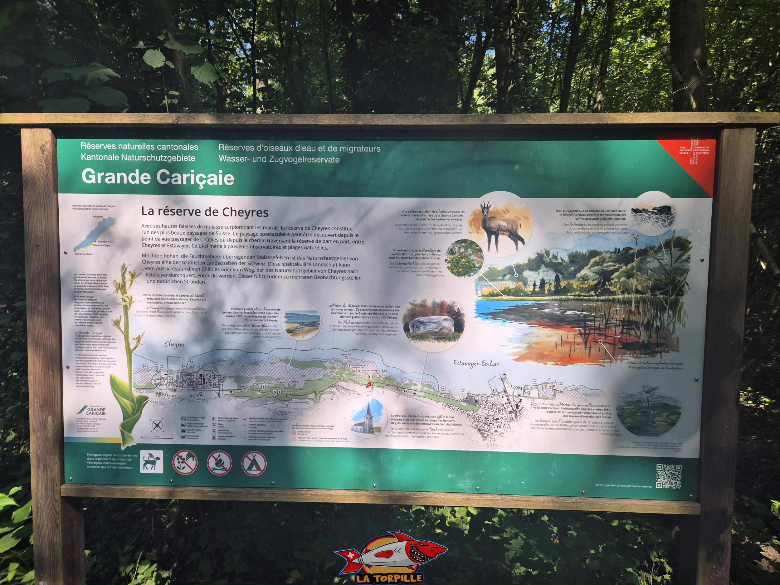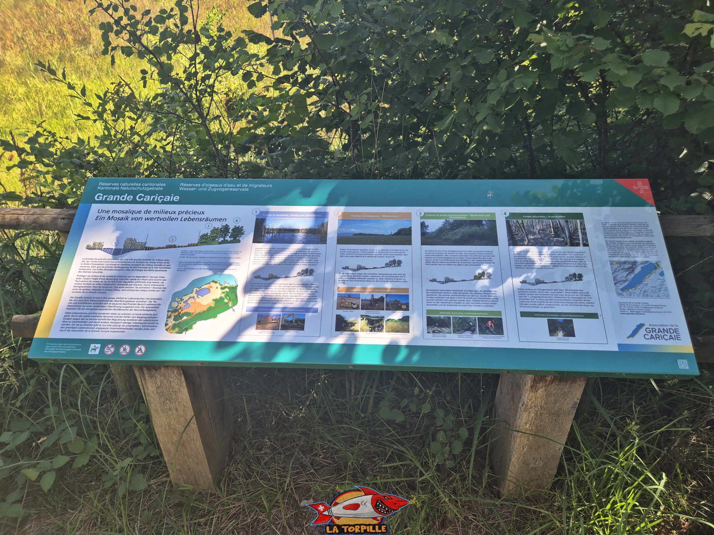 De nombreux panneaux didactiques sur les curiosités de la Grande Cariçaie viennent aider le visiteur.