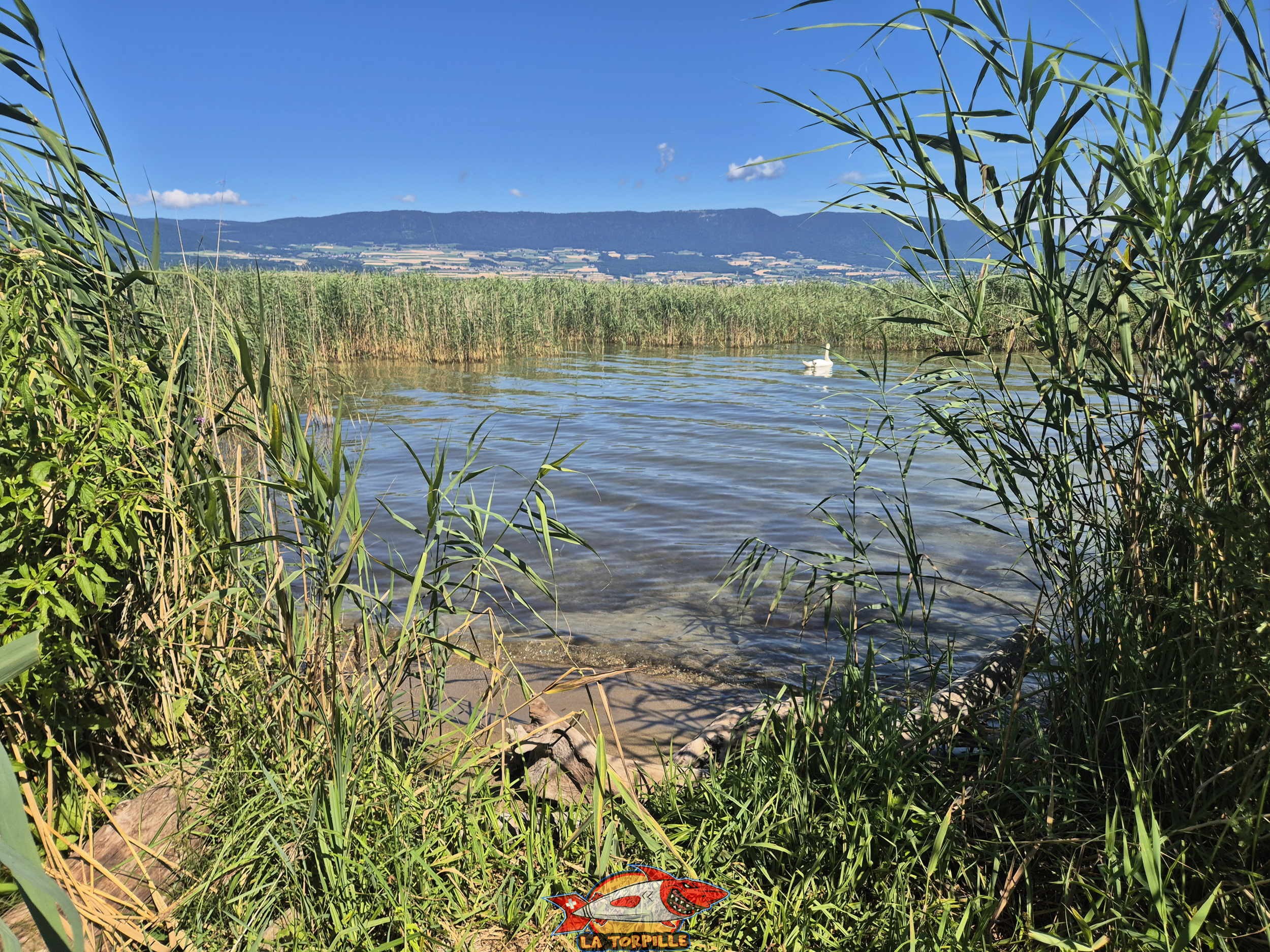La plage de Font I, dans le canton de Fribourg, avec les roseaux de la Grande Cariçaie.