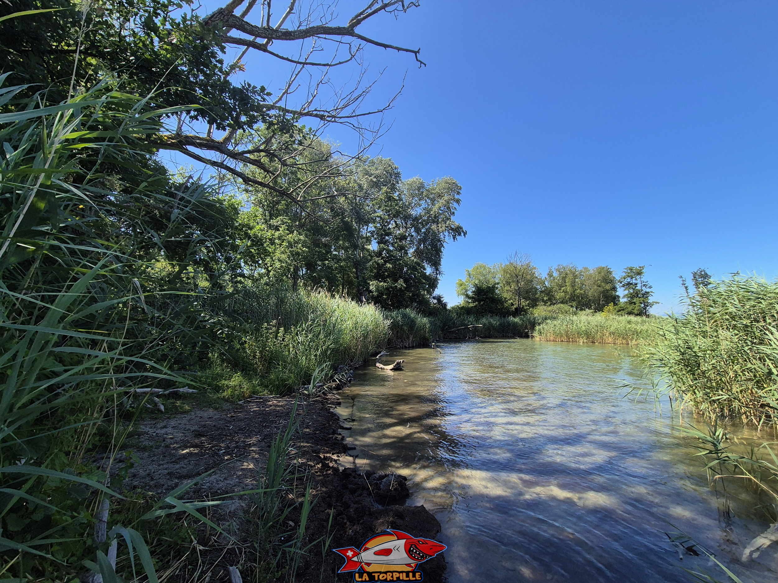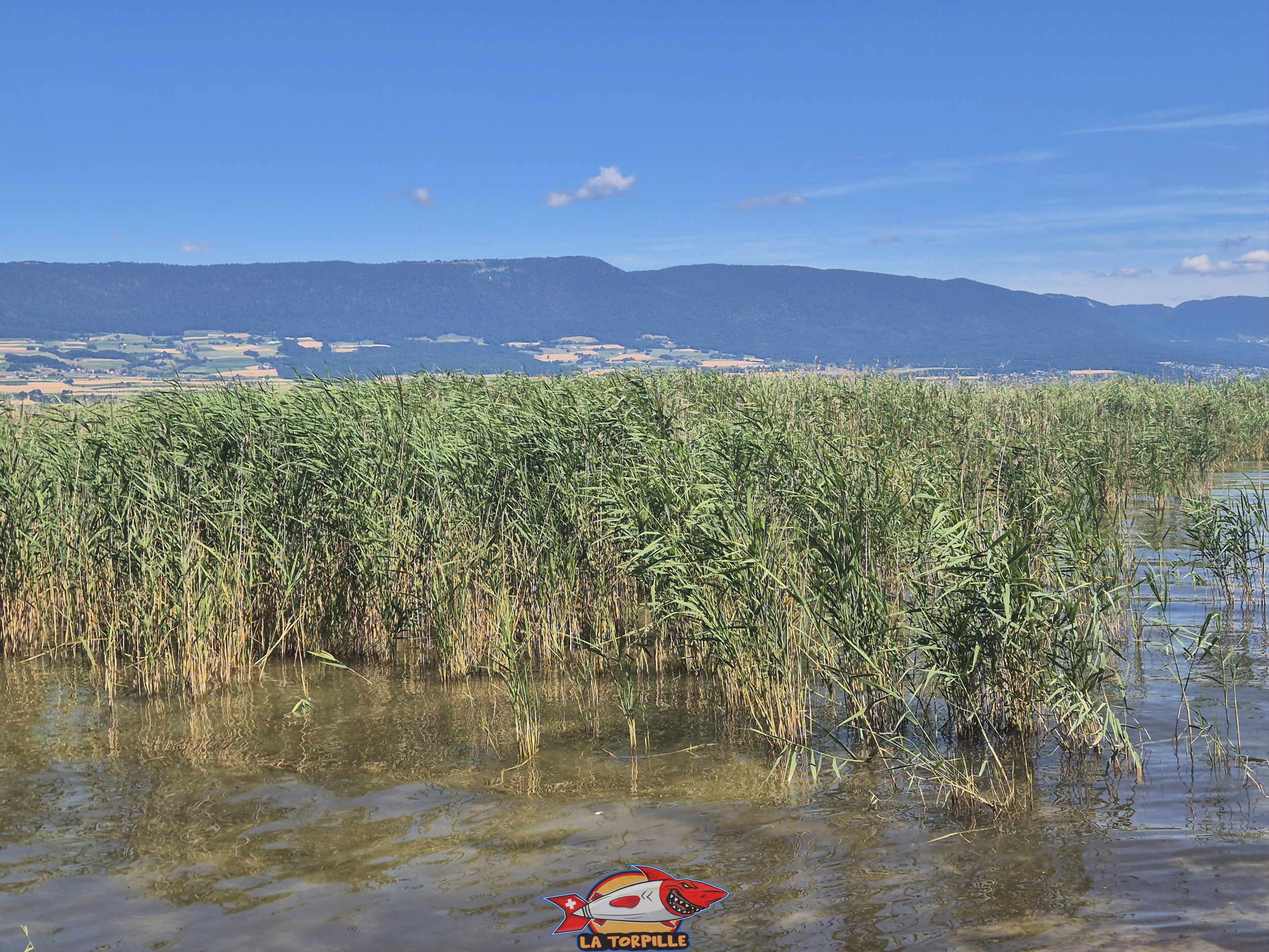Une zone typique de la Grande Cariçaie avec une zone marécageuse bordée par des roseaux.
