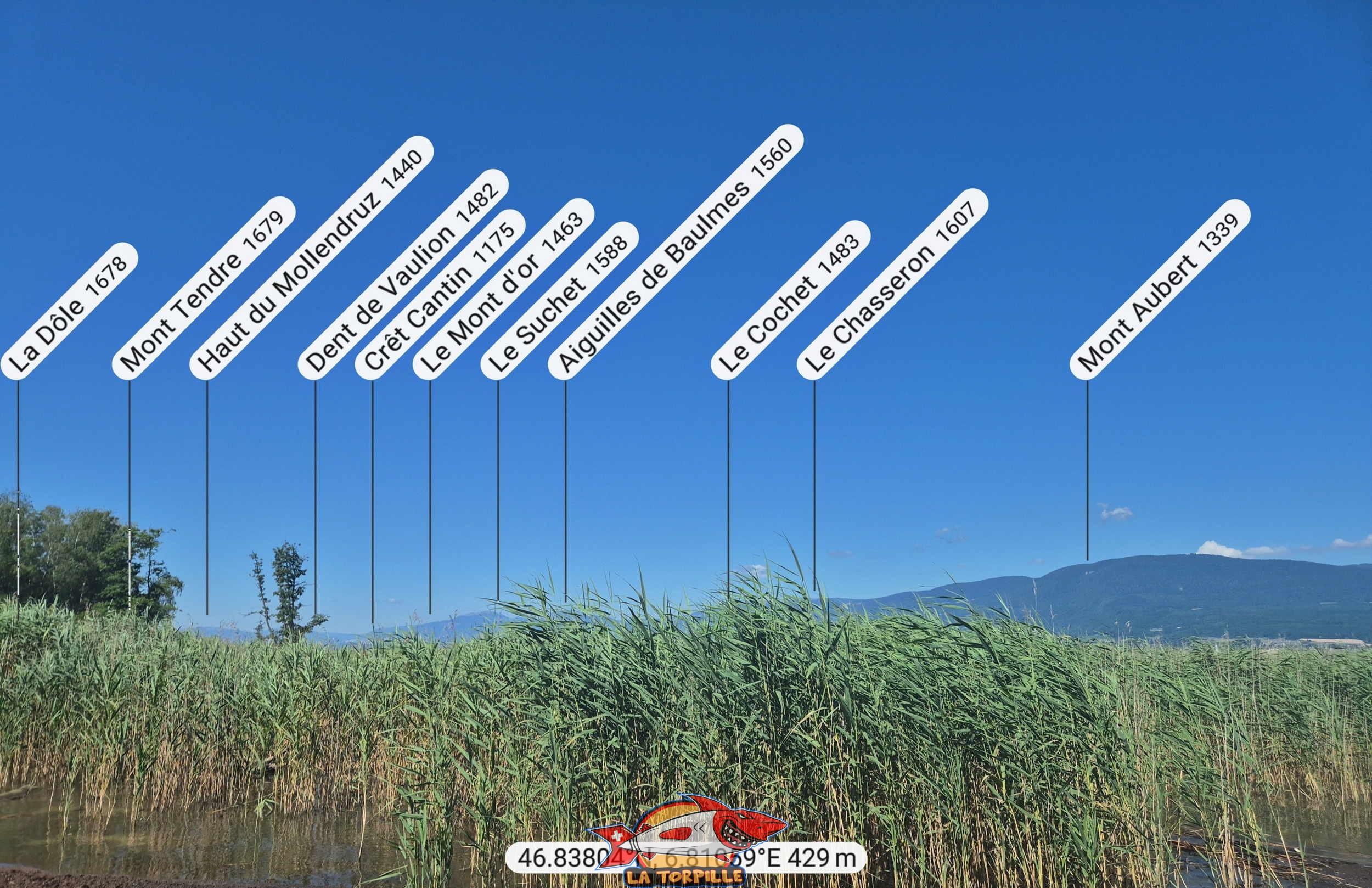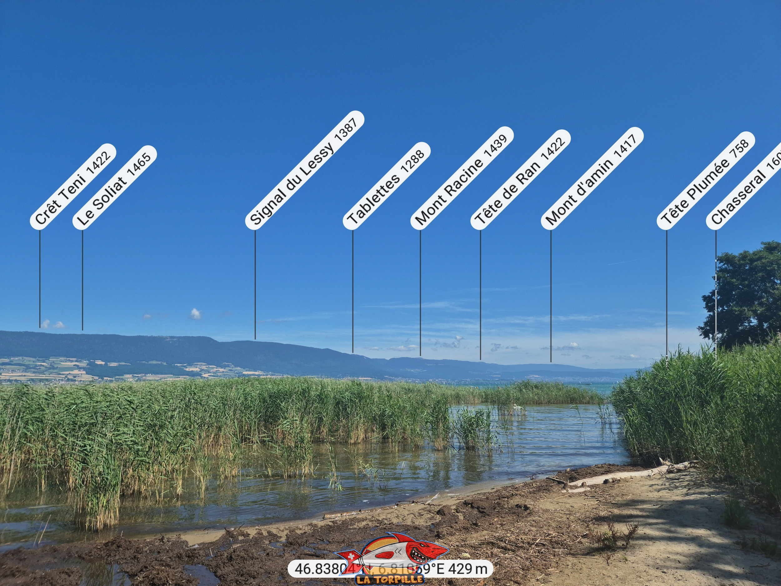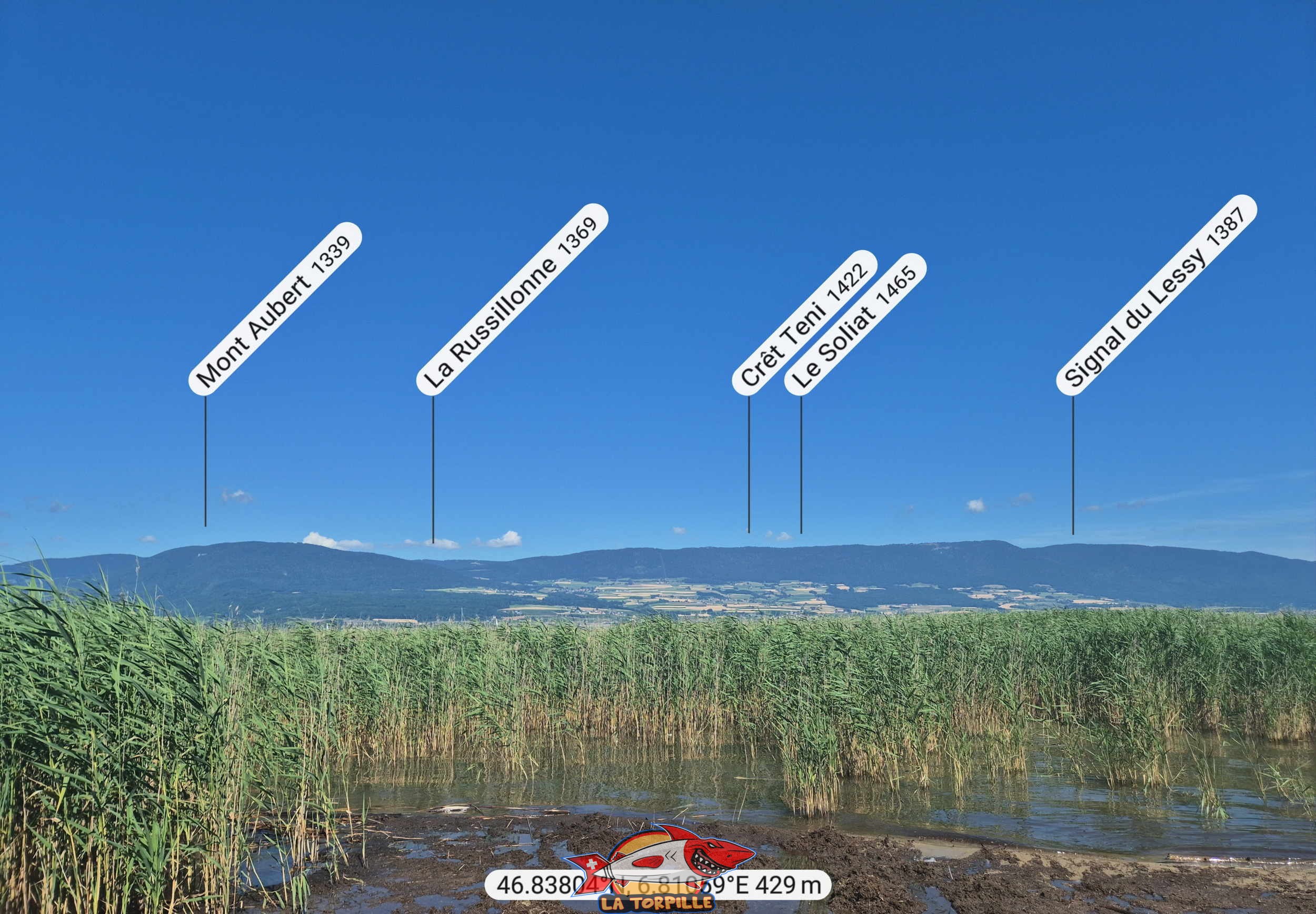 Le panorama, direction ouest, depuis la plage de Font I. Mollendruz, Le Suchet, Le Chasseron.