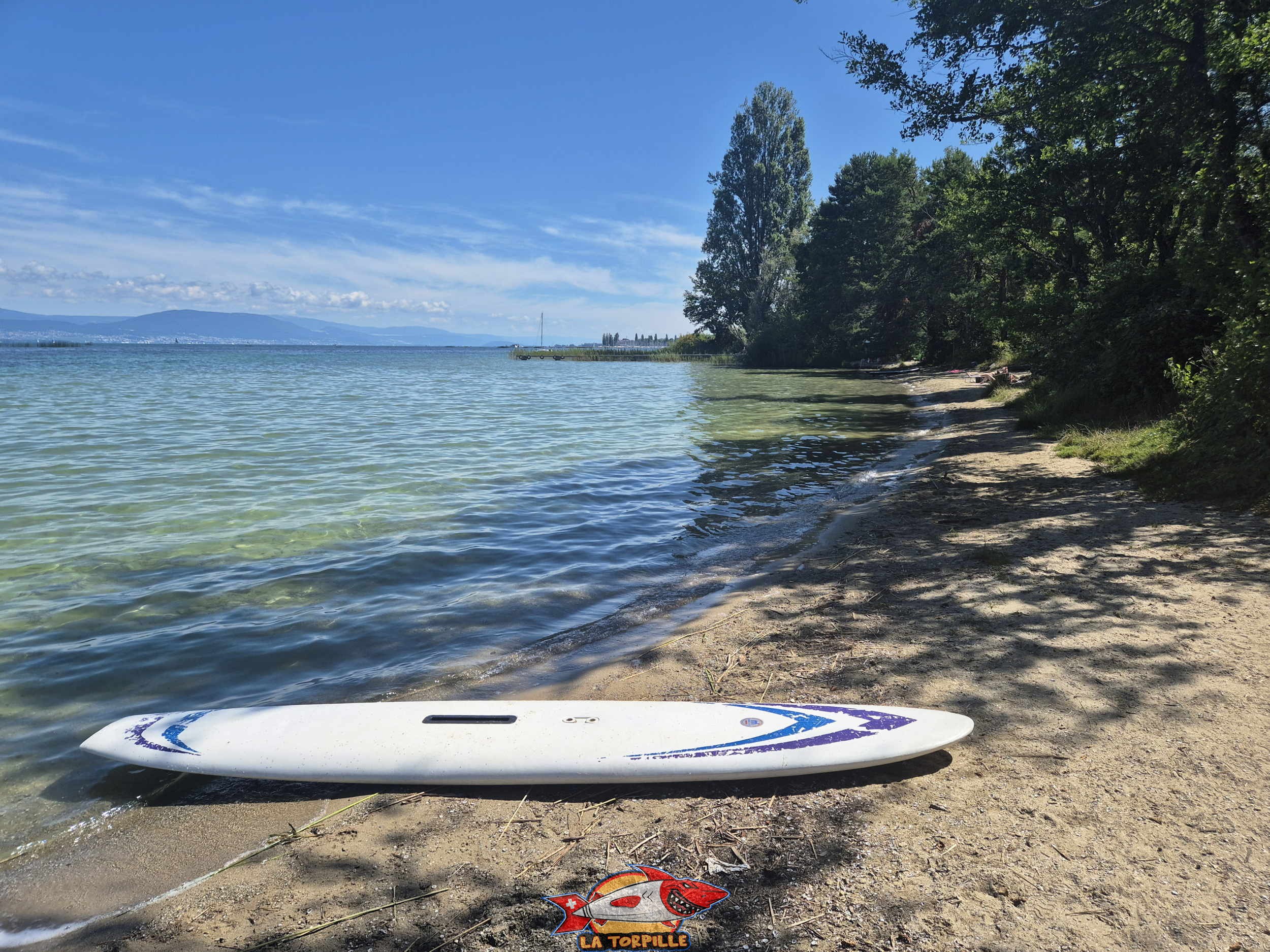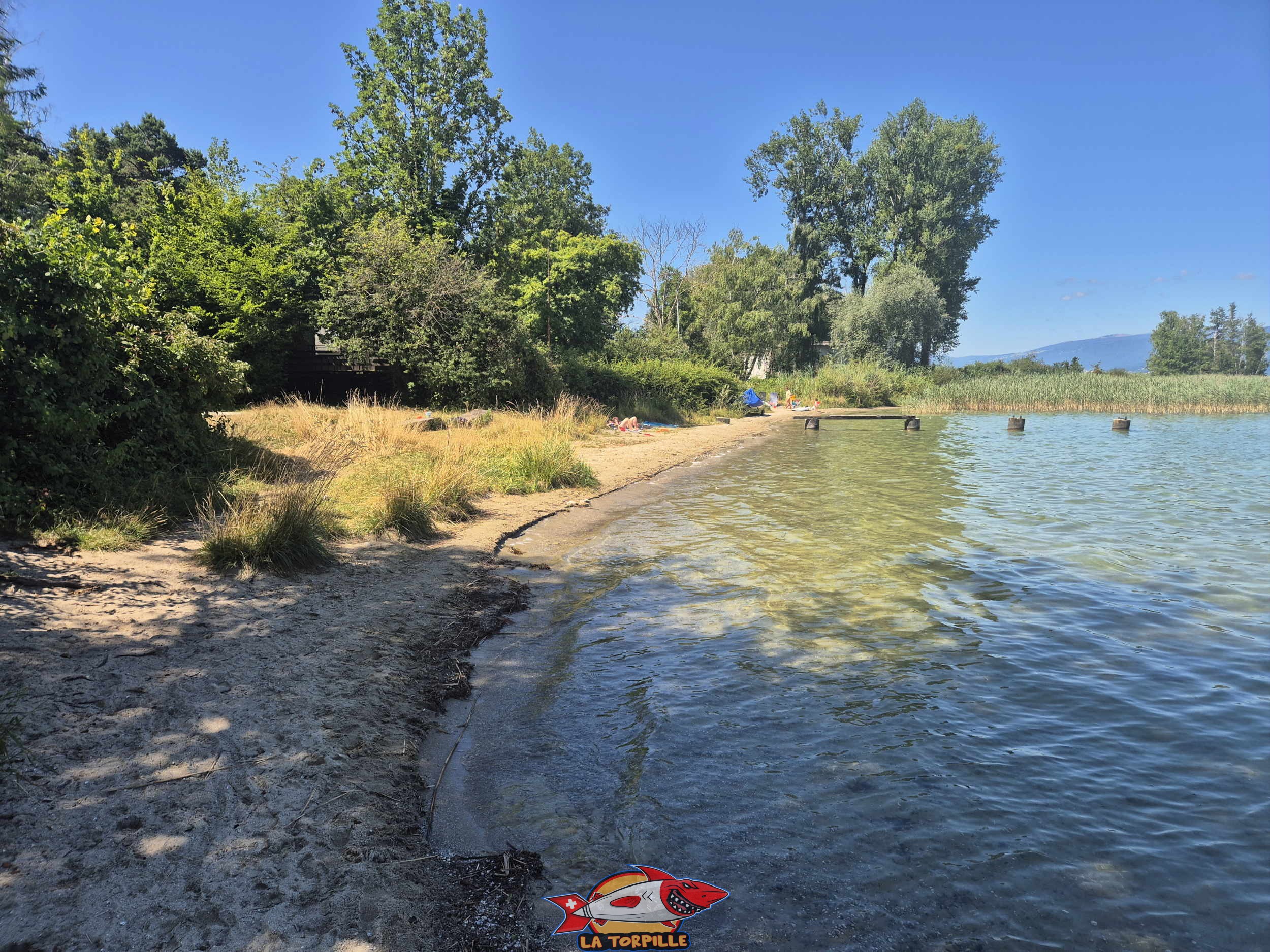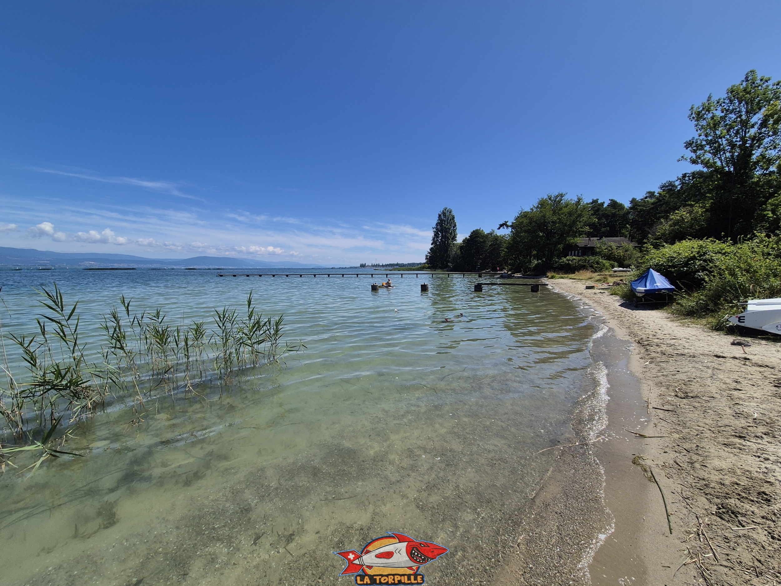 La plage de Font avec son long ponton sur la droite. Elle se trouve dans la région de la Broye fribourgeoise.