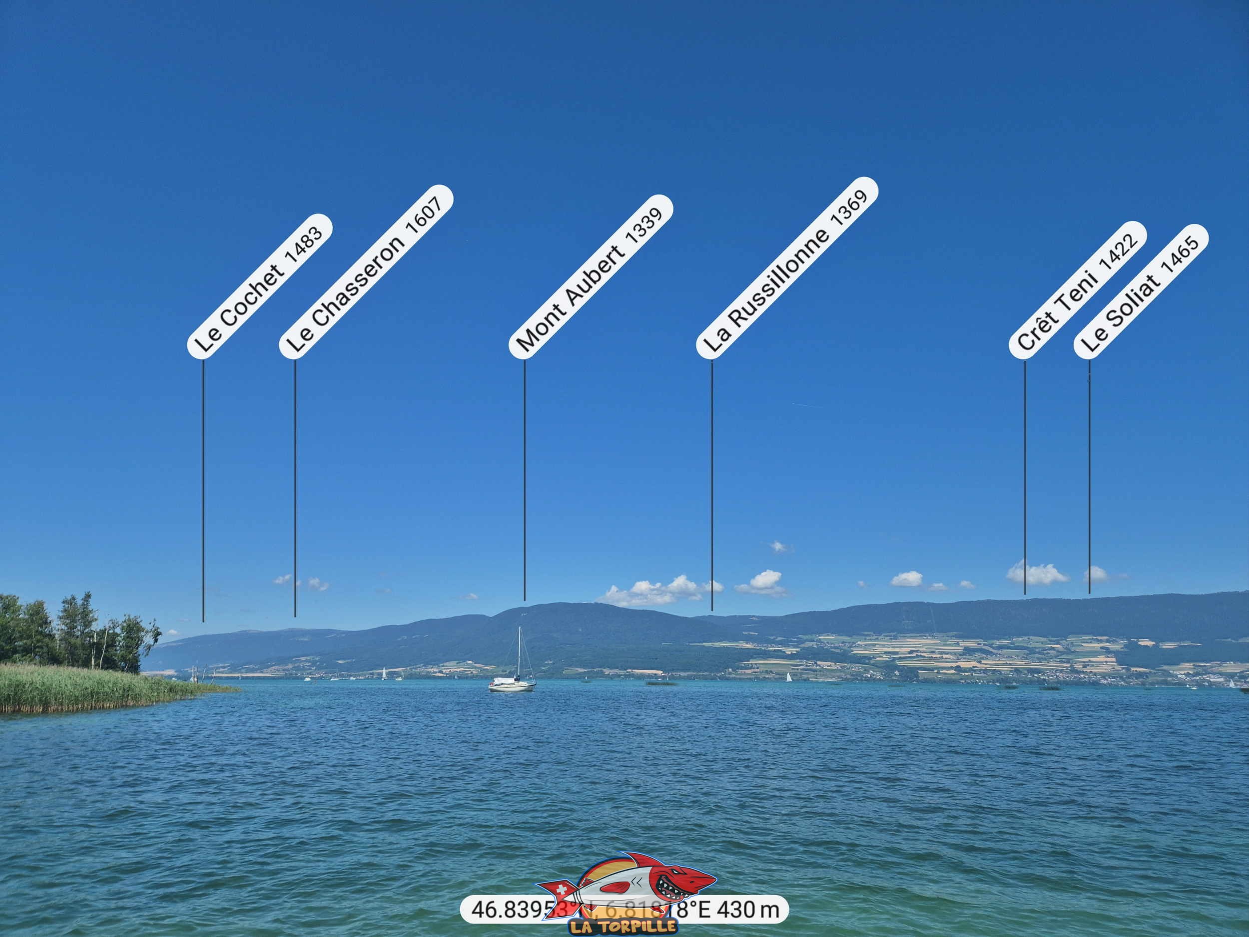Le panorama, direction ouest, depuis la plage de Font II. Le Cochet, le Chasseron, Mont Aubert, La Russillonne.