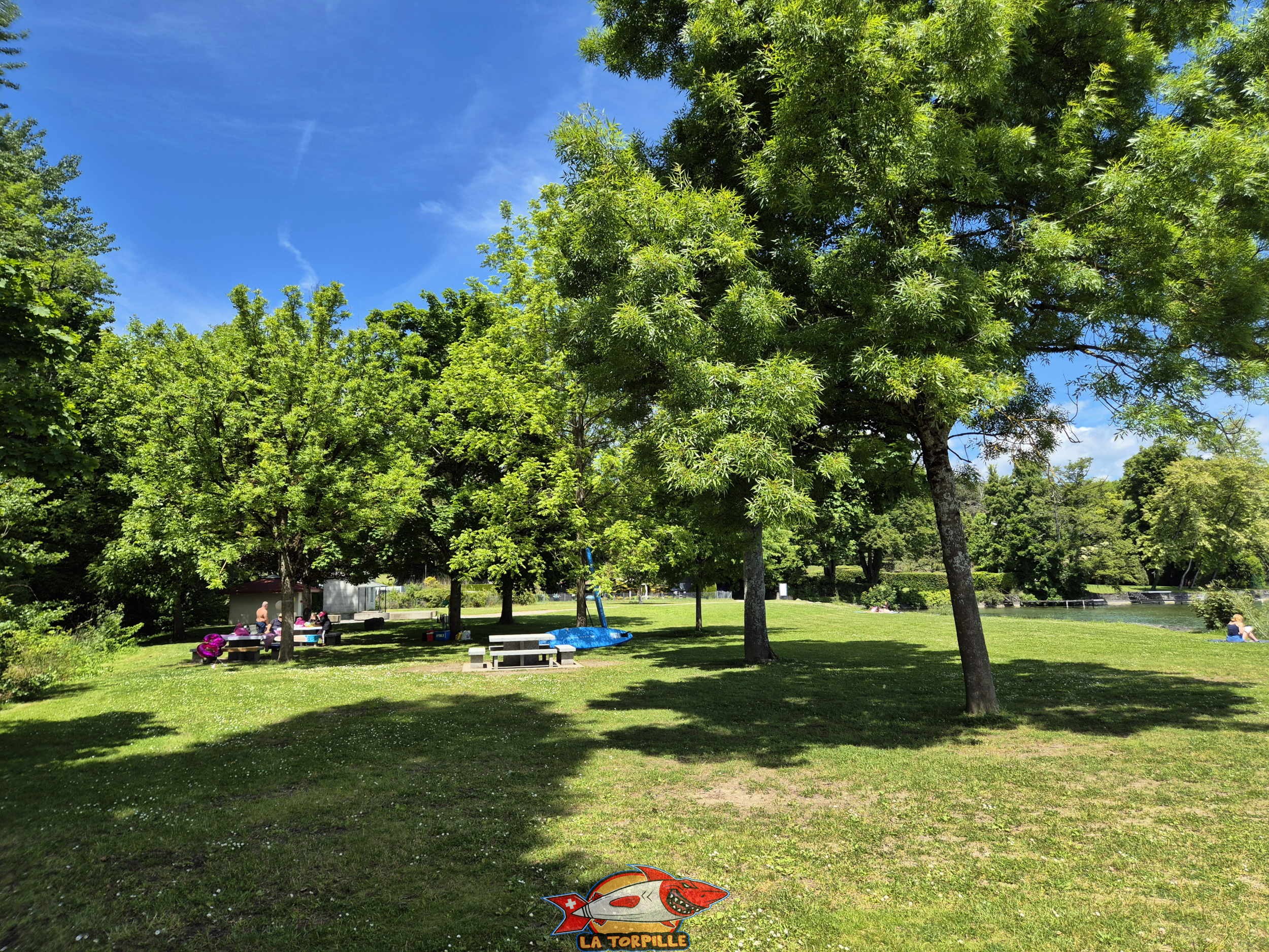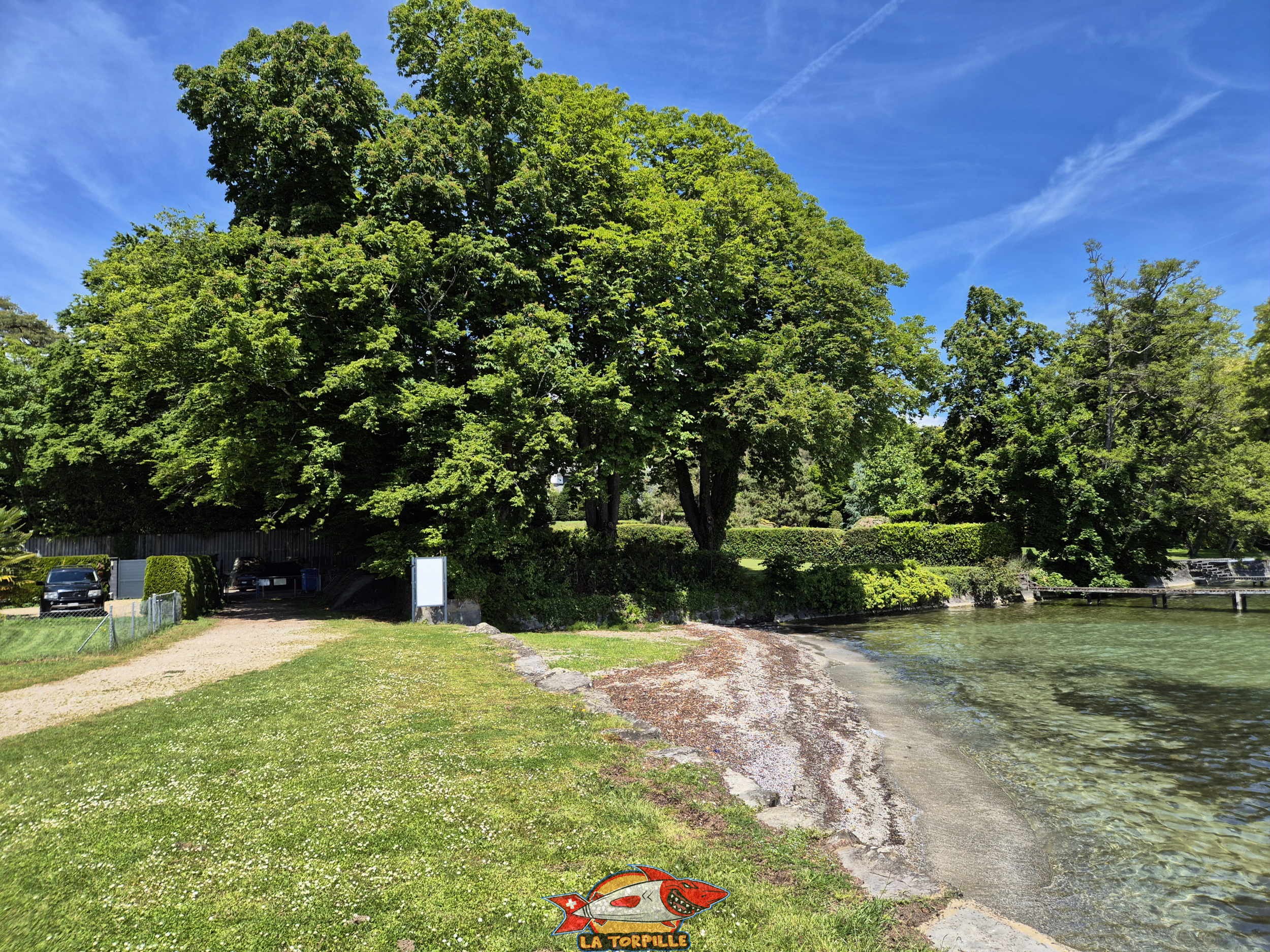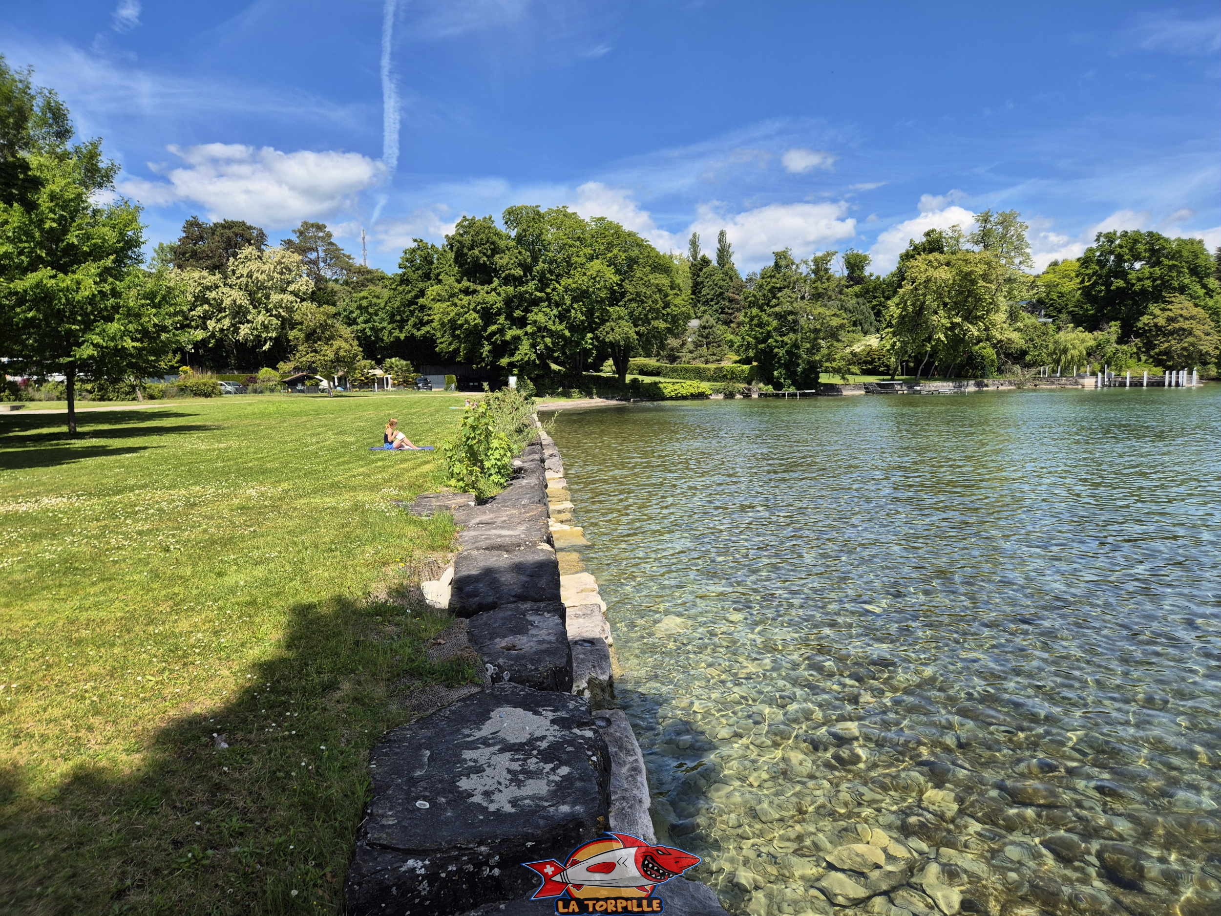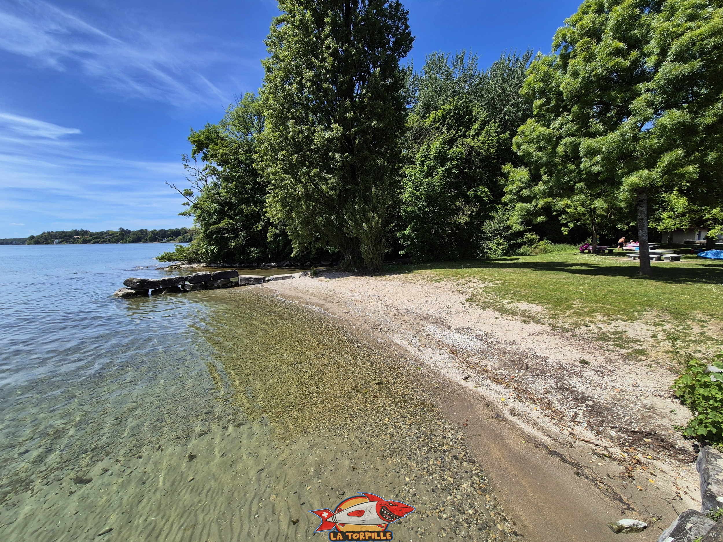 La plage est principalement constituée de pelouse ainsi que d’enrochements et de deux petites zones de sables pour l’accès au lac.
