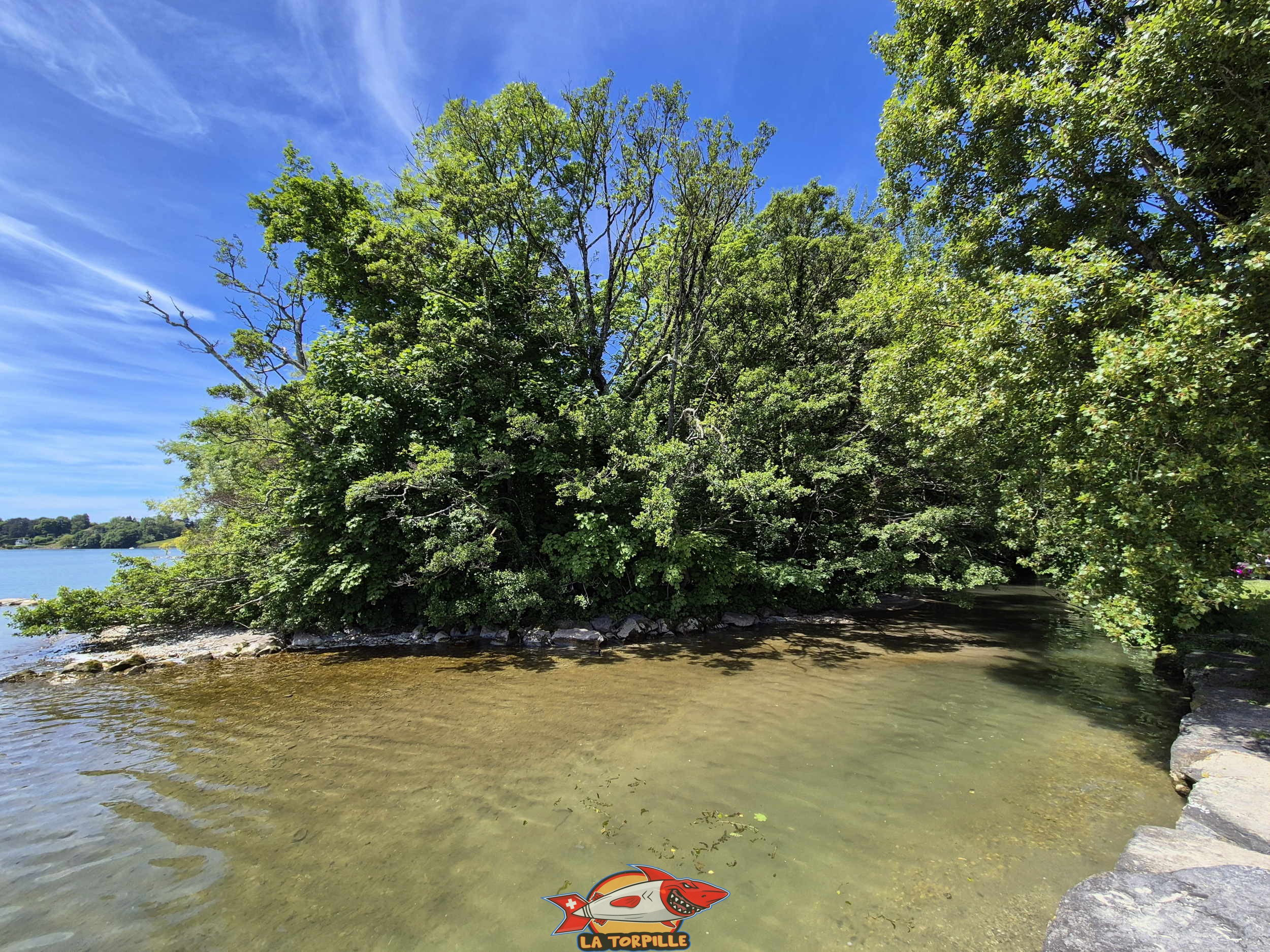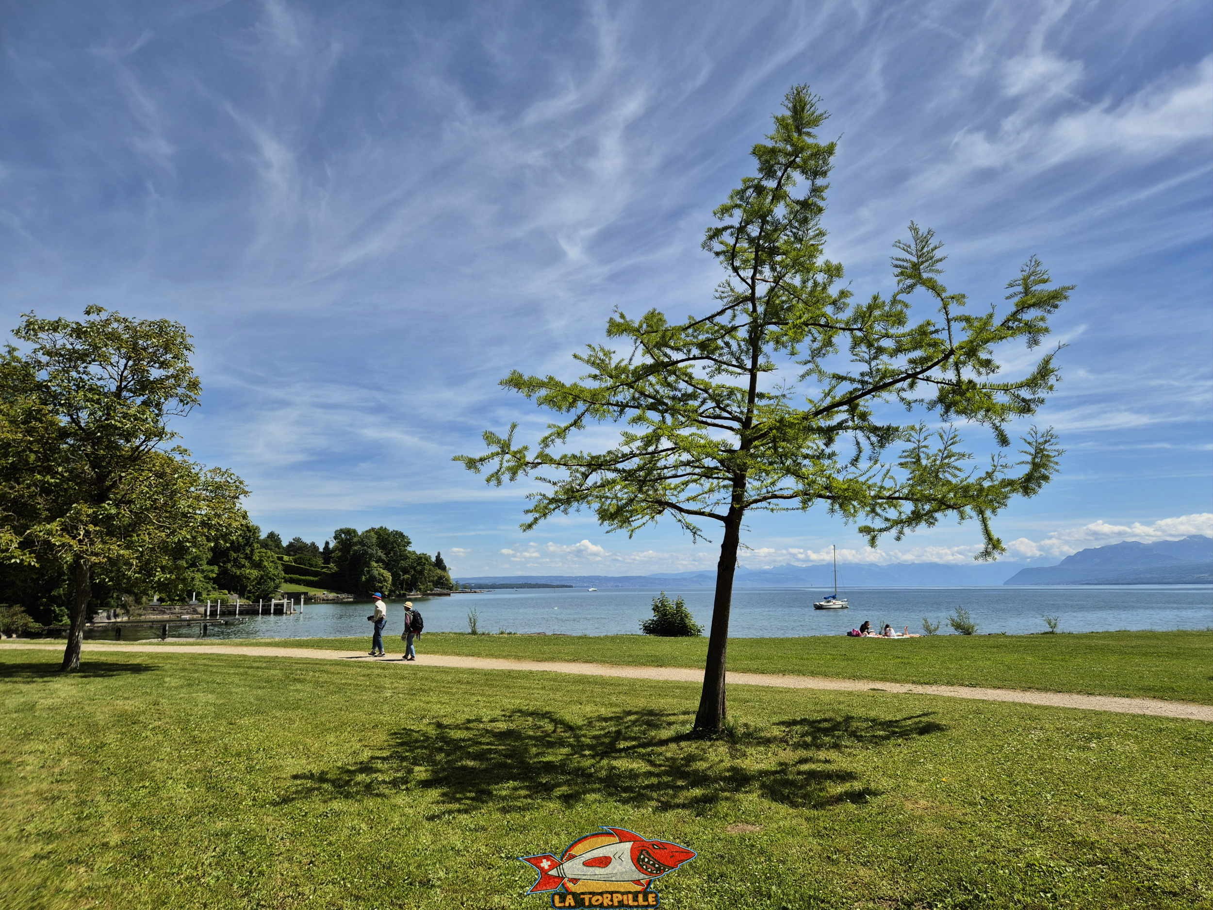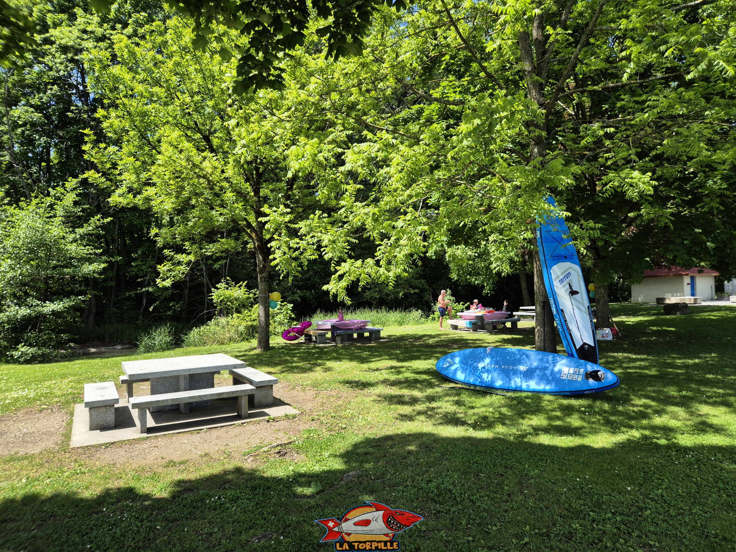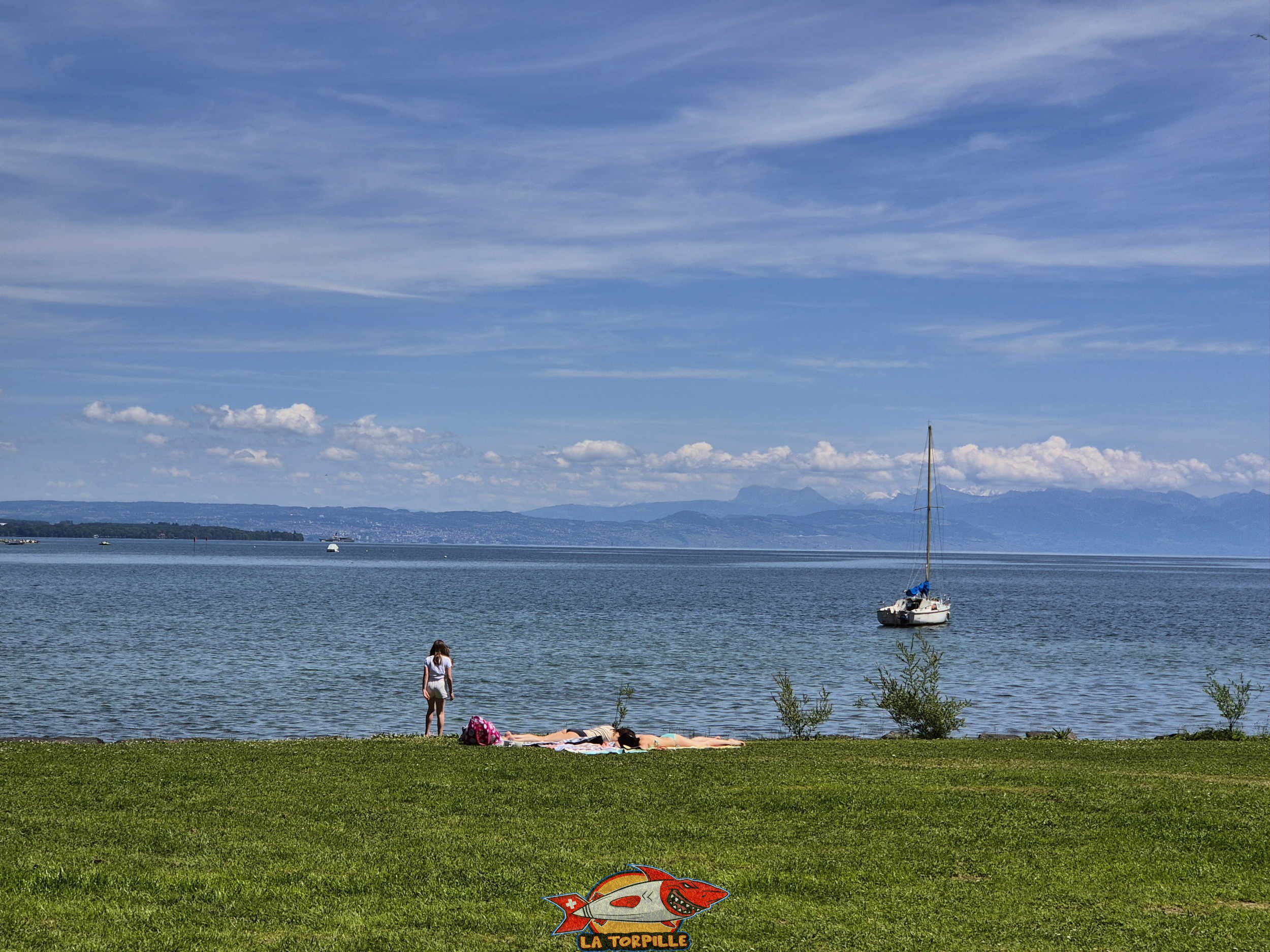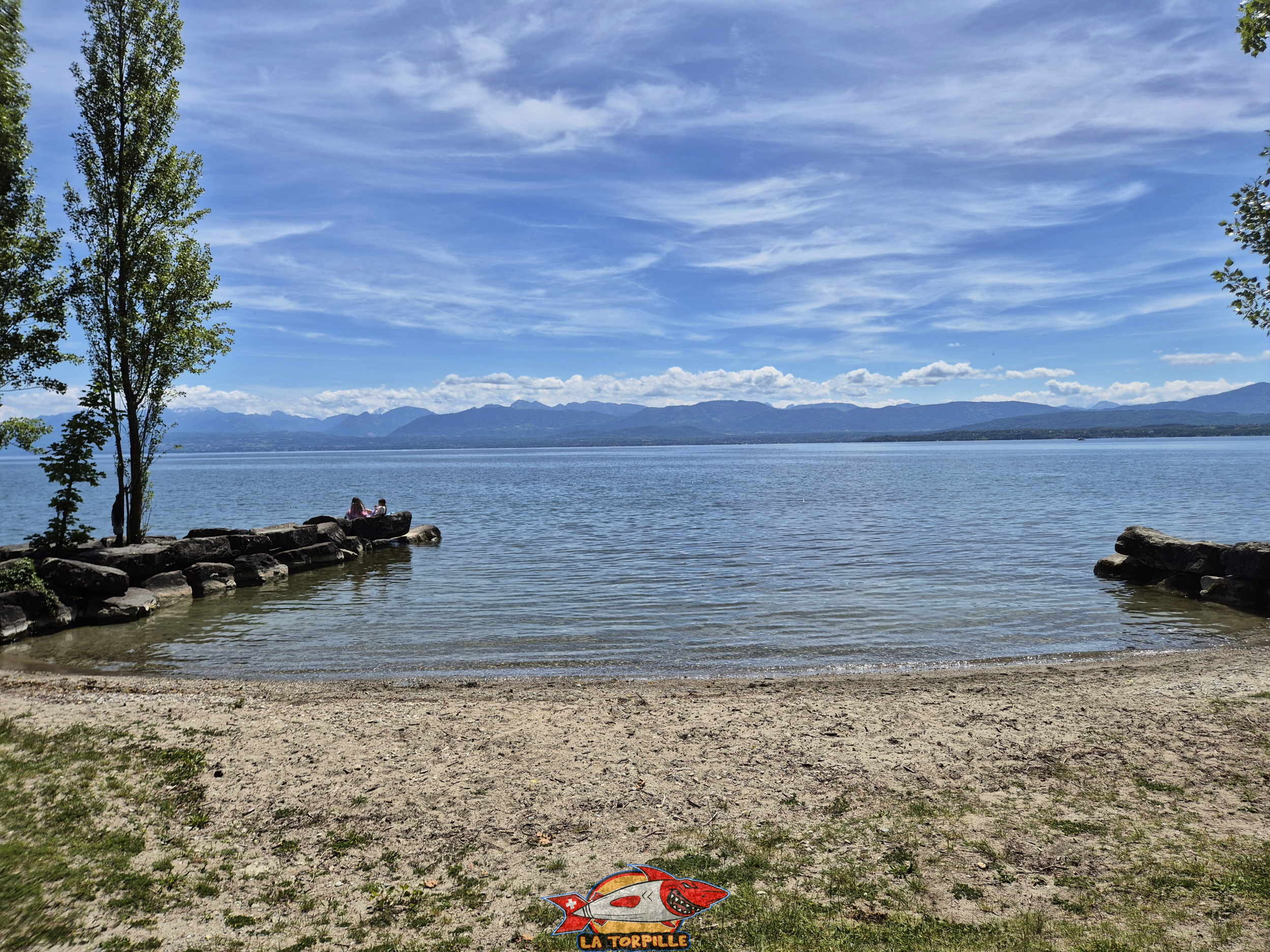 La plage est principalement constituée de pelouse ainsi que d’enrochements et de deux petites zones de sables pour l’accès au lac.