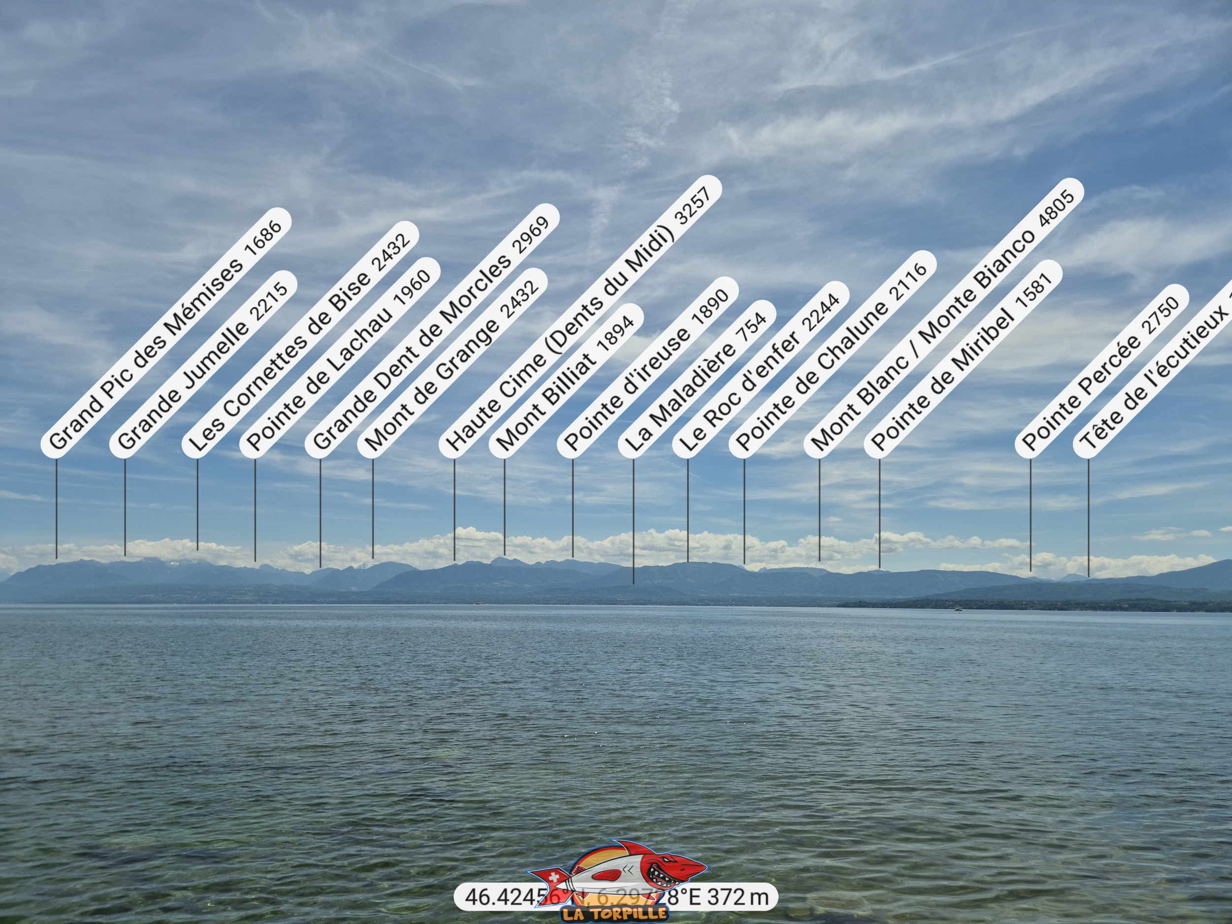 La vue direction Sud-Est depuis la plage de la Dullive. Le Mont Blanc.