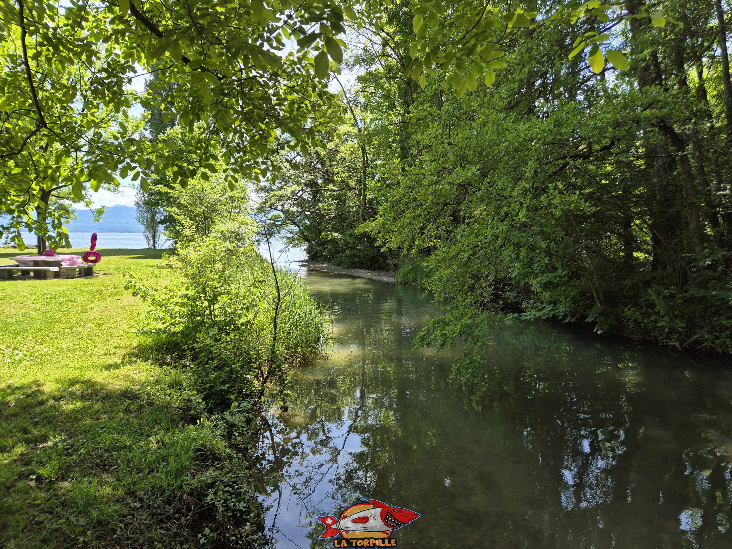 La Dullive coule au niveau du côté ouest de la plage puis se jette dans le Léman. Elle marque, dans sa partie inférieure, la séparation entre les communes de Gland et de Dully.
