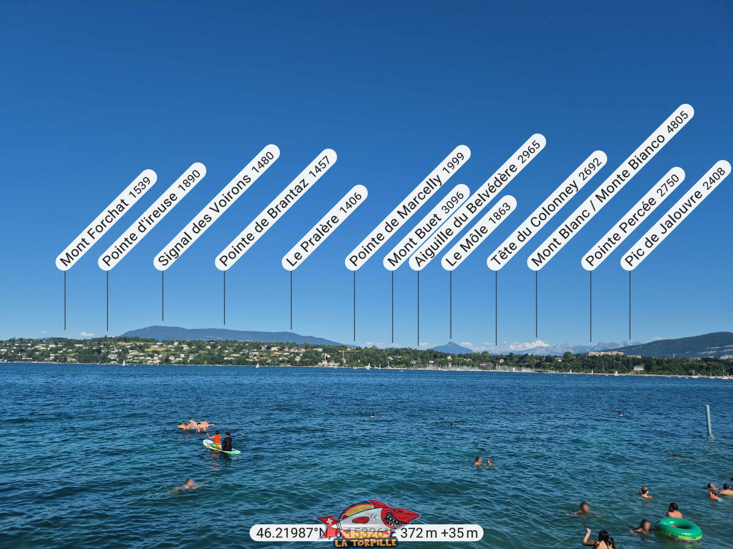 Le panorama, direction sud-est, depuis la plage de la perle du lac. Le Signal des Voirons et le Mont Blanc à 70 km.