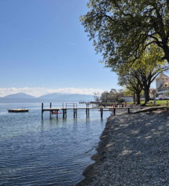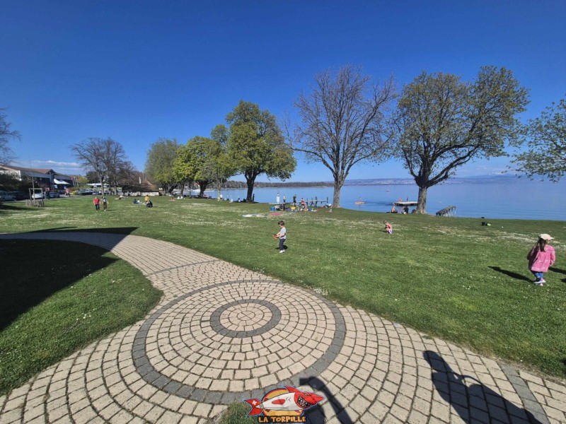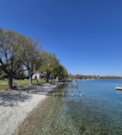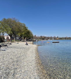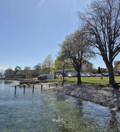 La plage de la Place d’Armes se trouve à St-Prex, au bord du Léman, entre Morges et Rolle, sur la Côte vaudoise.