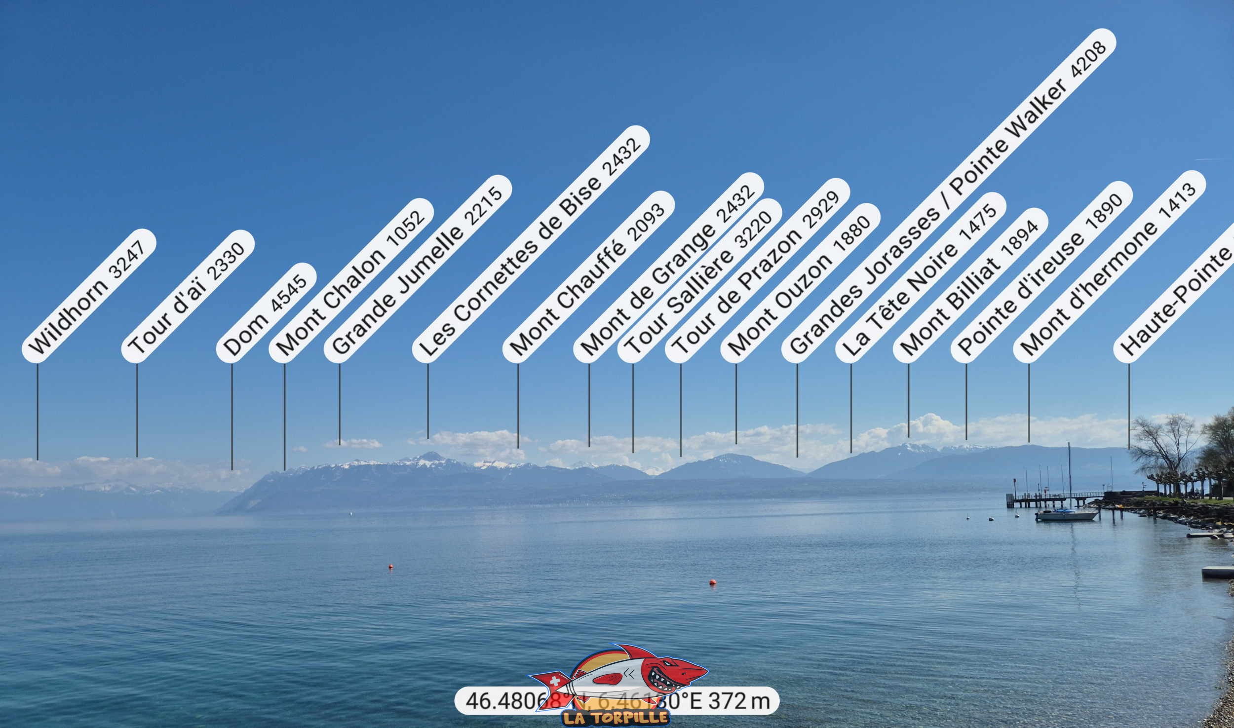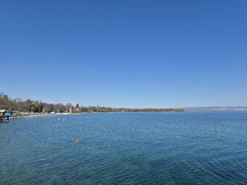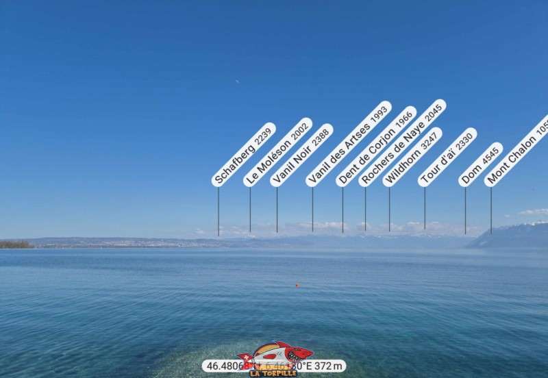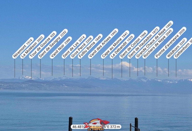 La vue direction est depuis la plage de la Place d’Armes. Le Moléson, le Vanil Noir et les Rochers de Naye.