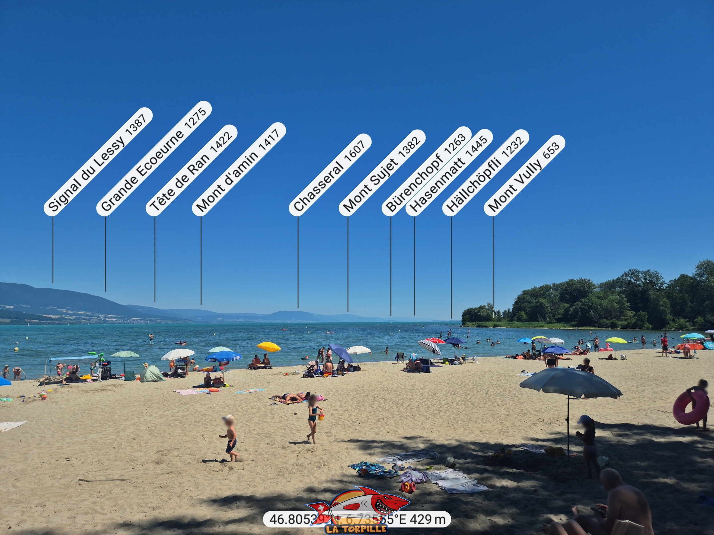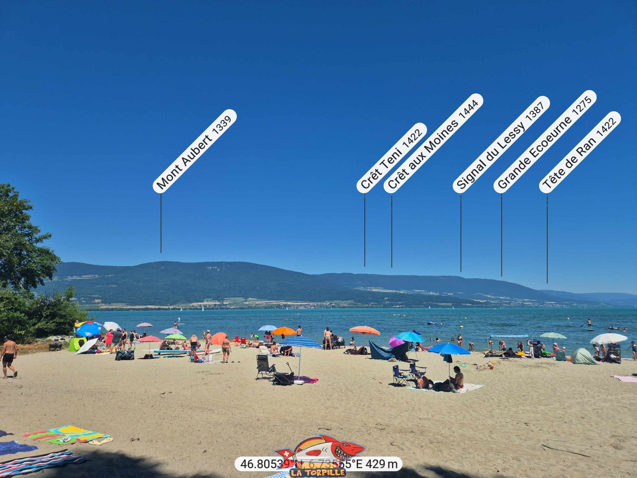 Le panorama, direction nord-est, depuis la plage des Pins. Tête de Ran, le Chasseral, le Mont Sujet.