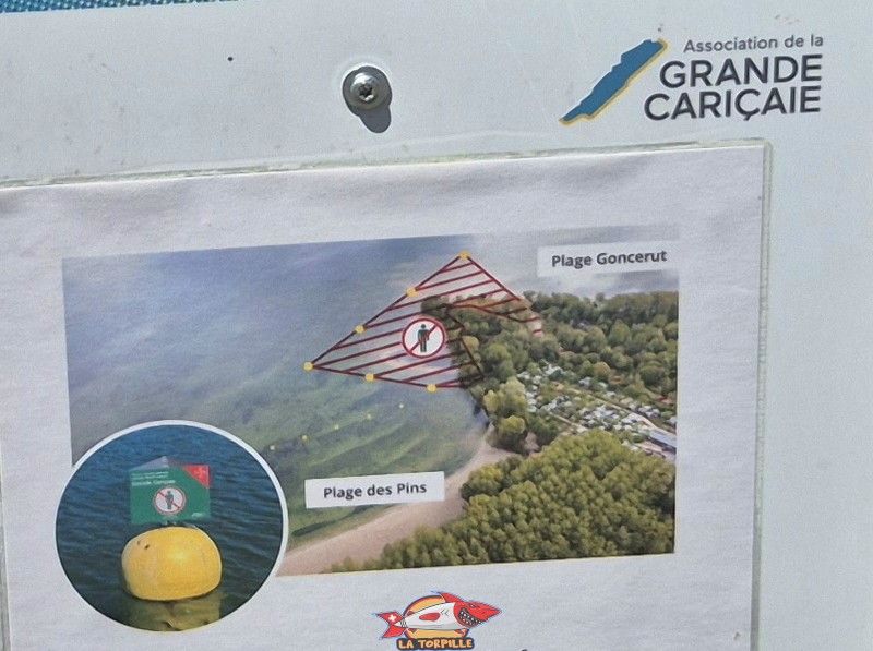Un panneau qui montre le positionnement de la plage des Pins à l’ouest de la réserve de la Baie d’Yvonand.