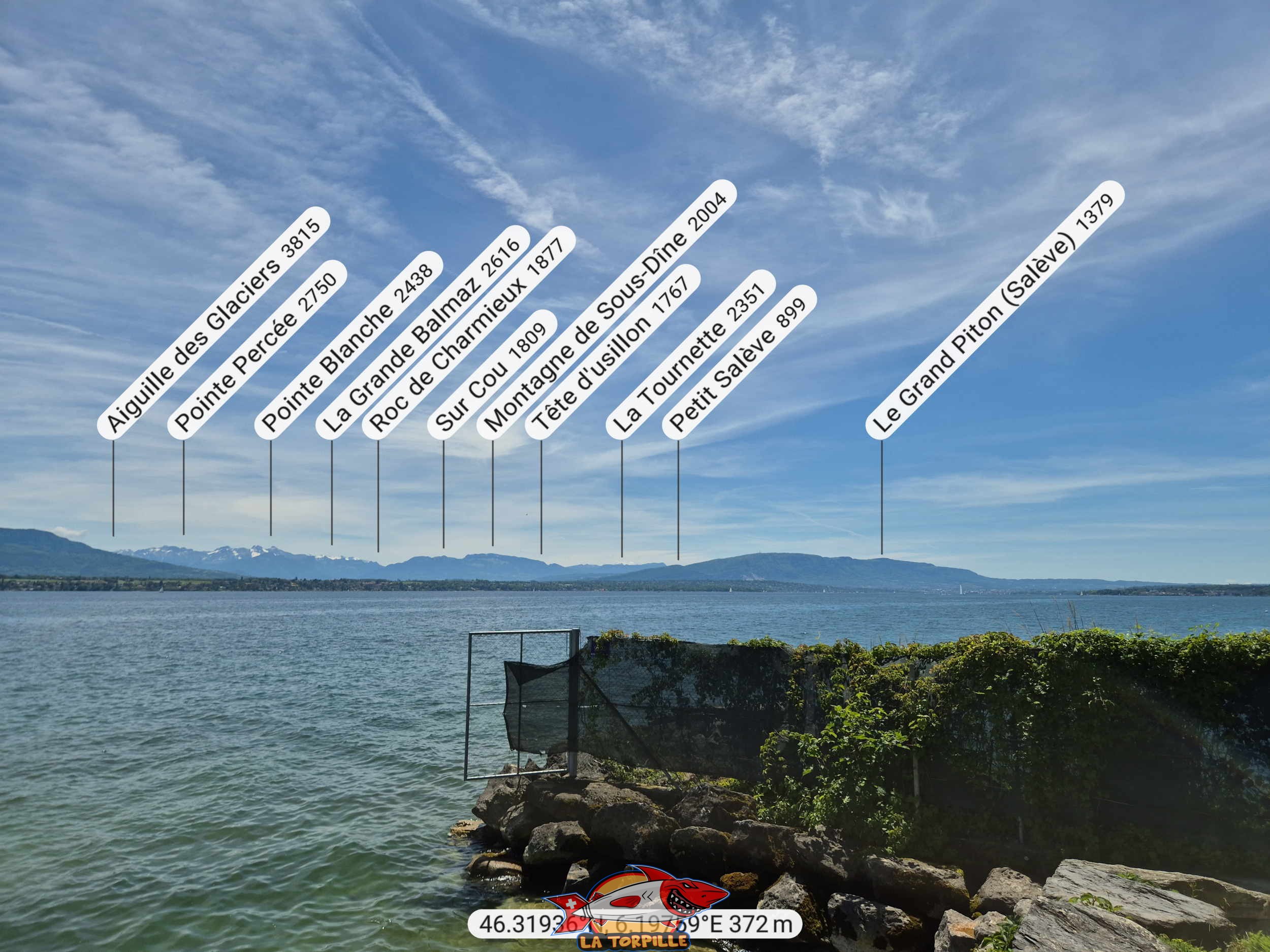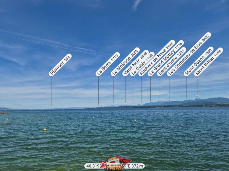 La vue direction Sud-Est-Est depuis la plage des Rocailles de Coppet. Les Dents du Midi, la Tour Sallière.