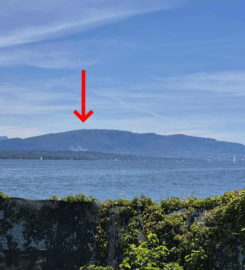 Le Salève depuis la plage des Rocailles. En rouge, l’antenne du Salève.