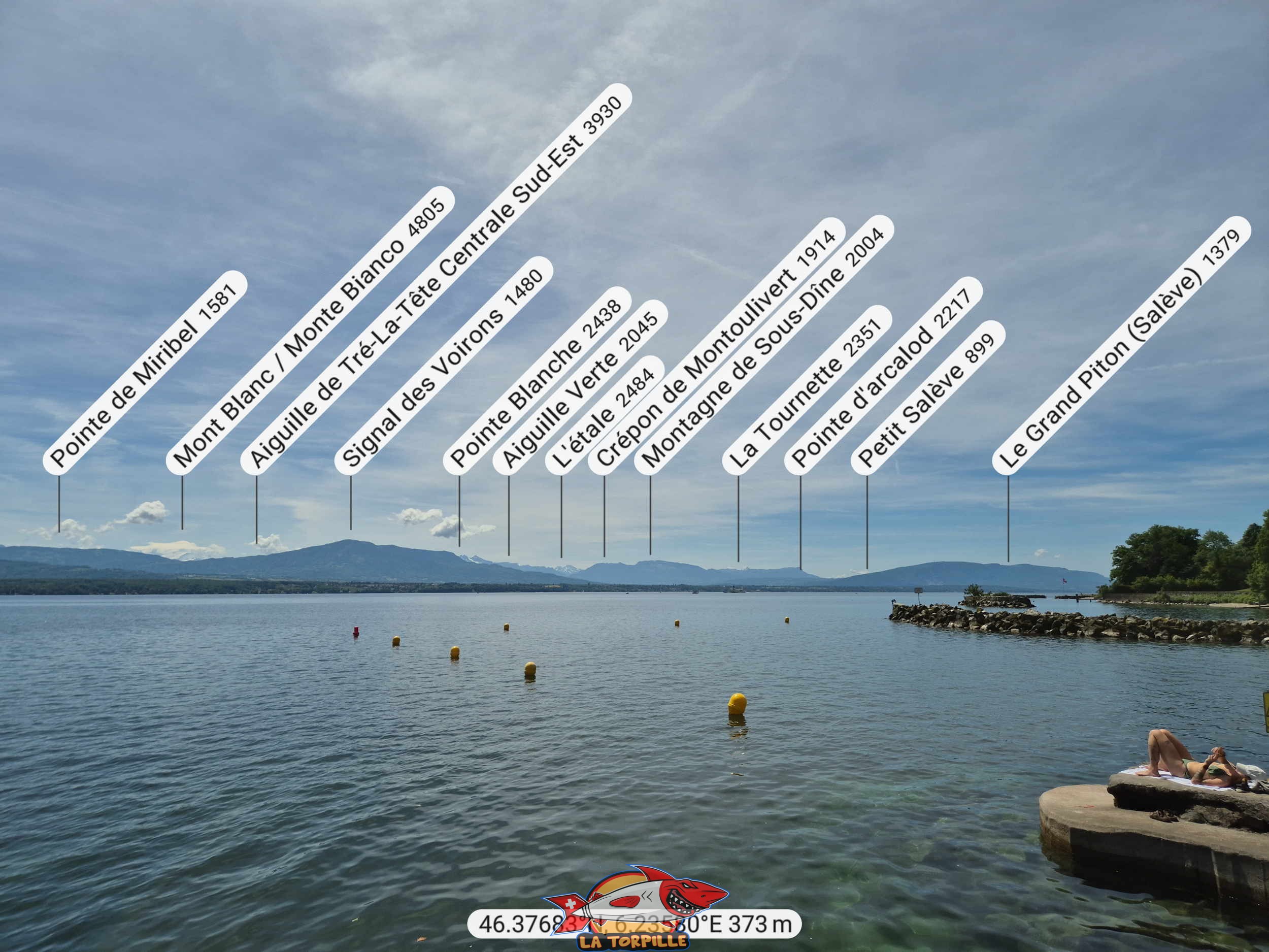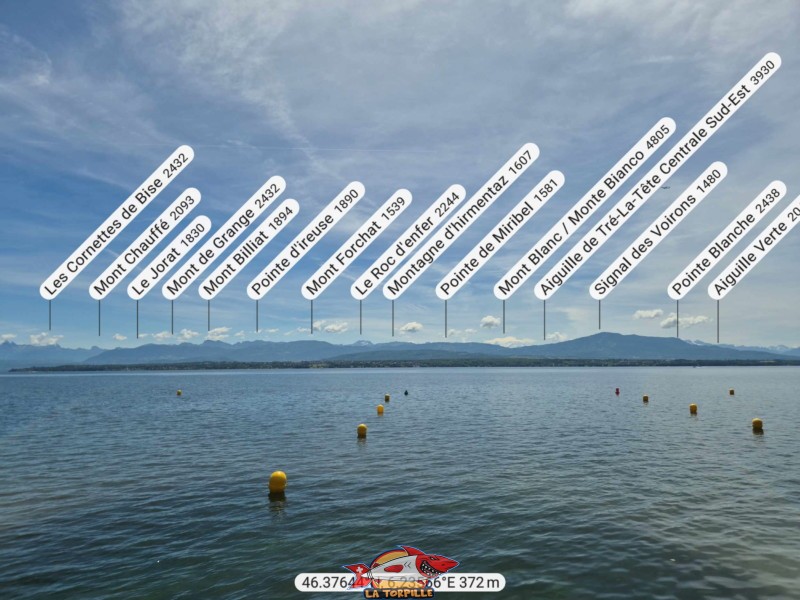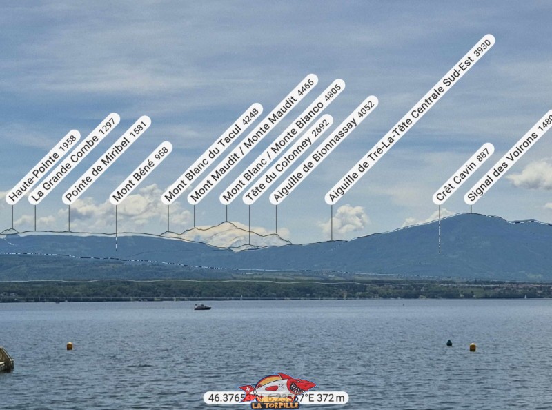Le zoom en direction du Mont Blanc depuis la plage des Trois Jetées.