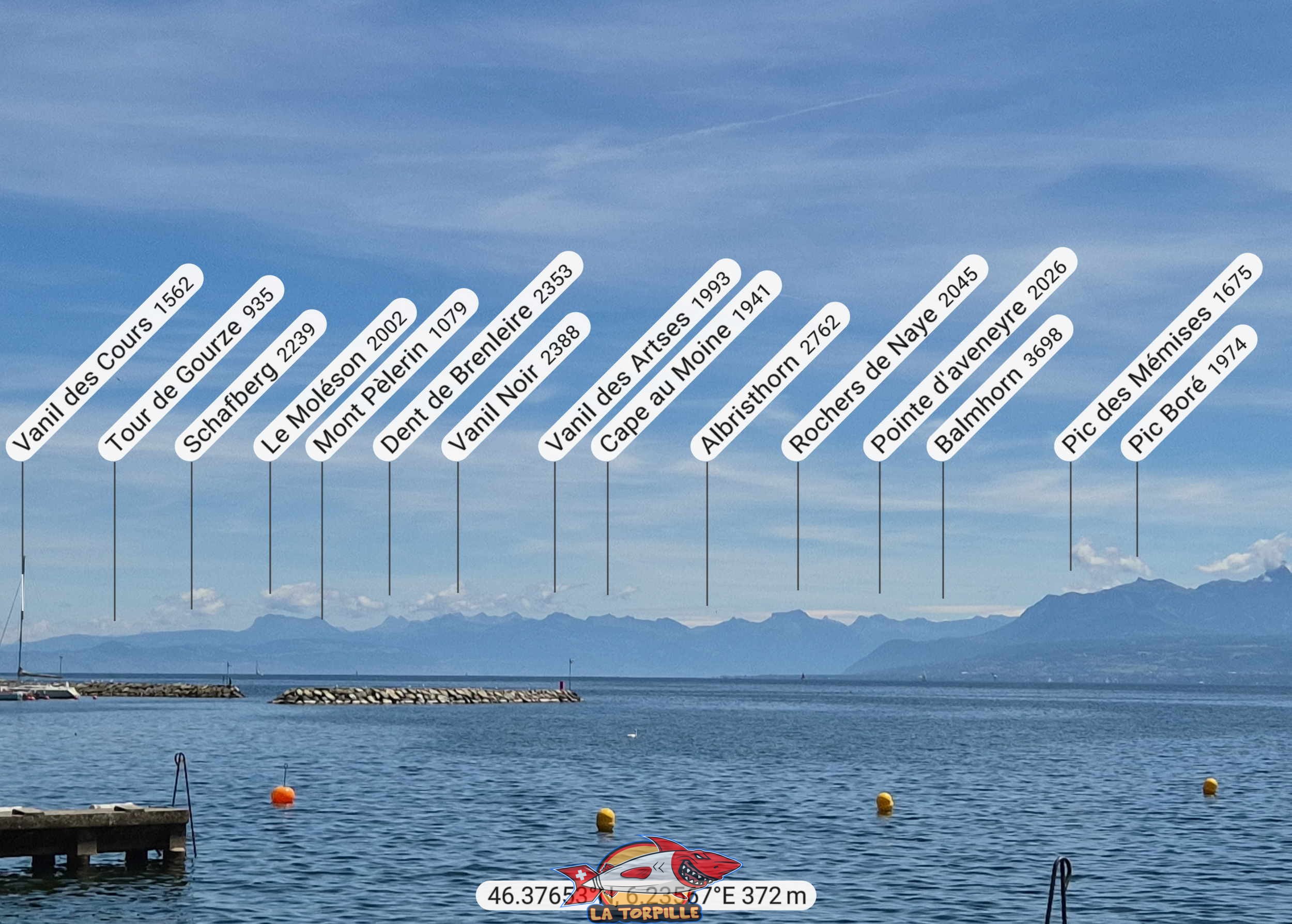 Le zoom sur les Alpes fribourgeoises et vaudoises depuis la plage des Trois Jetées.