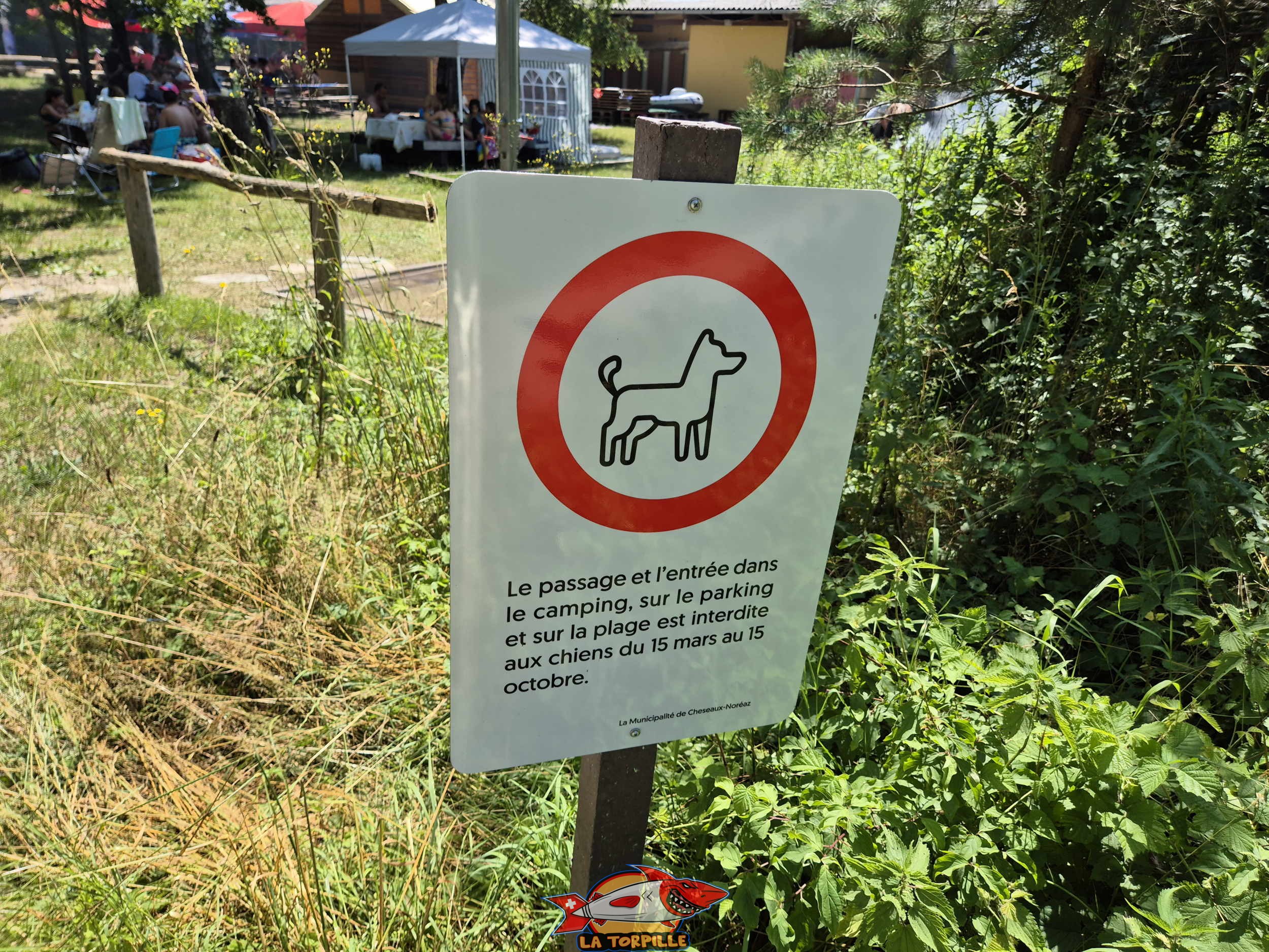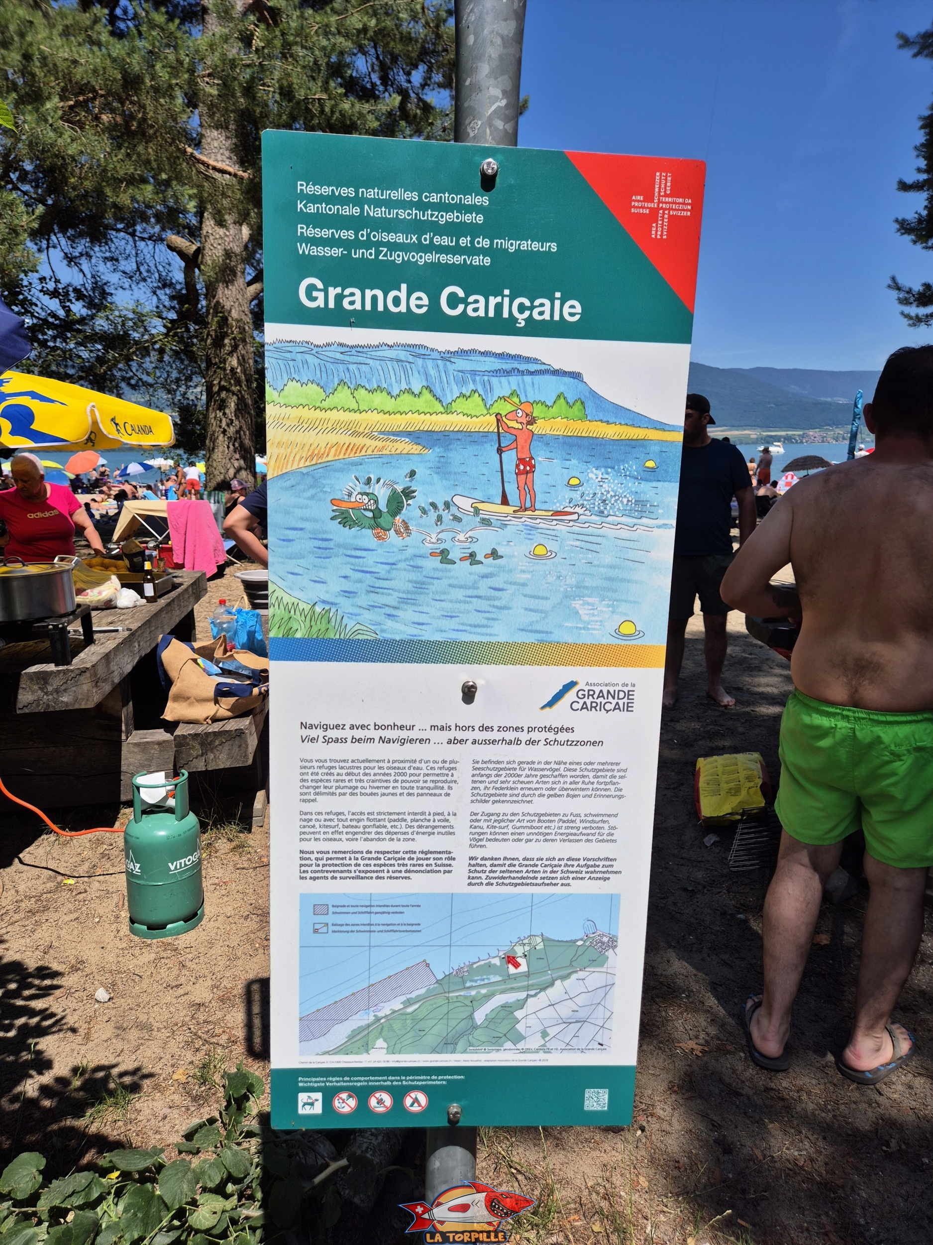 Un panneau qui rappelle que la plage se trouve à proximité de la Grande Cariçaie, une zone marécageuse située sur la rive sud-est du lac de Neuchâtel. Des bouées rappellent les zones interdites.