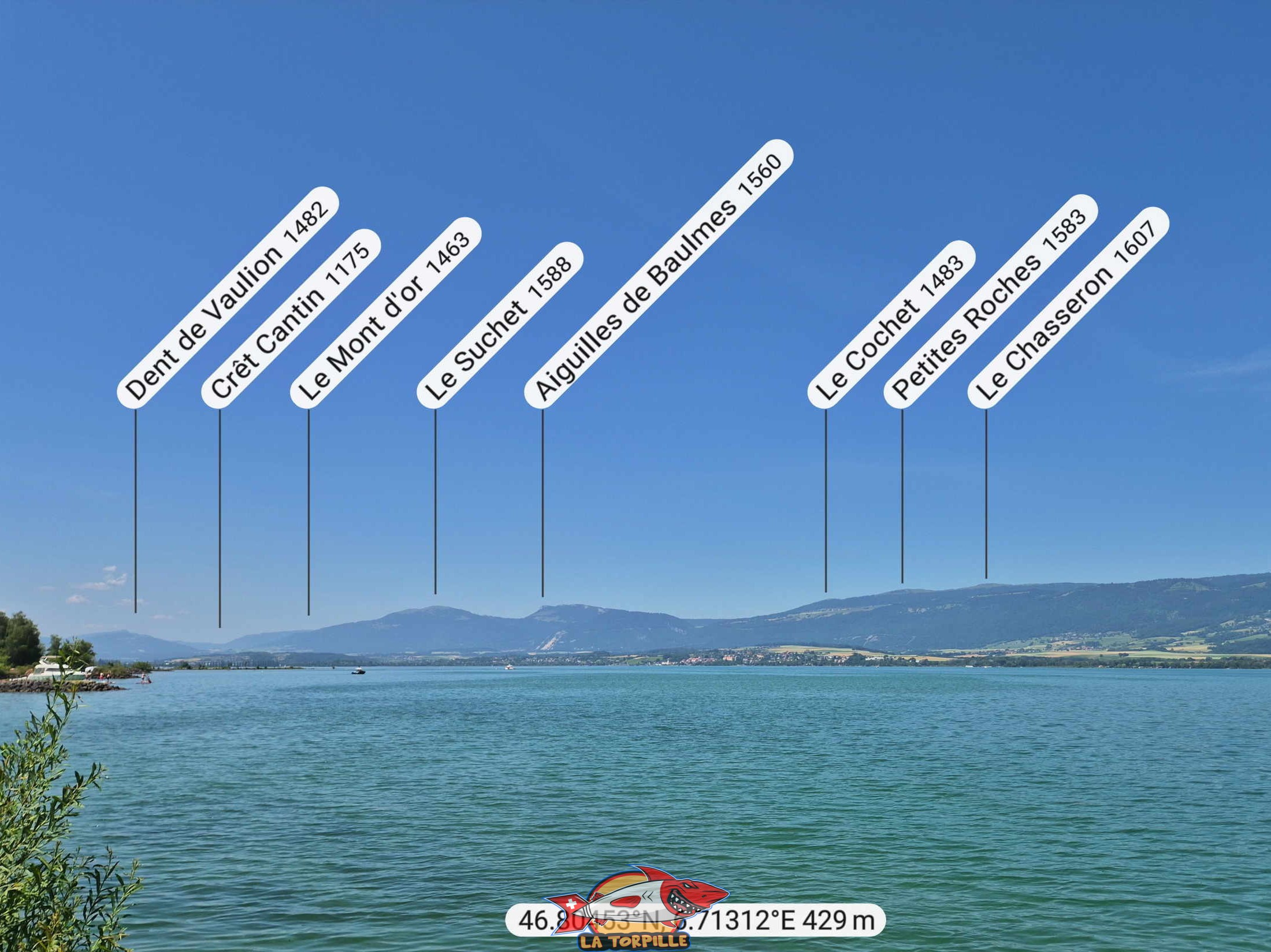 La vue, direction ouest, depuis la plage du camping VD8. La Dent de Vaulion, les Aiguilles de Baulmes, le Chasseron.