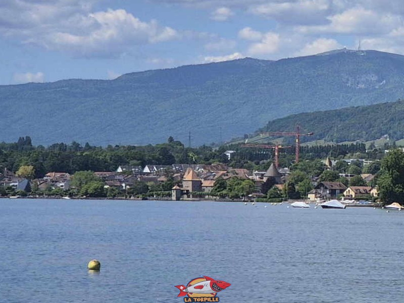Le zoom sur le château de Rolle depuis la plage du Plongeon.