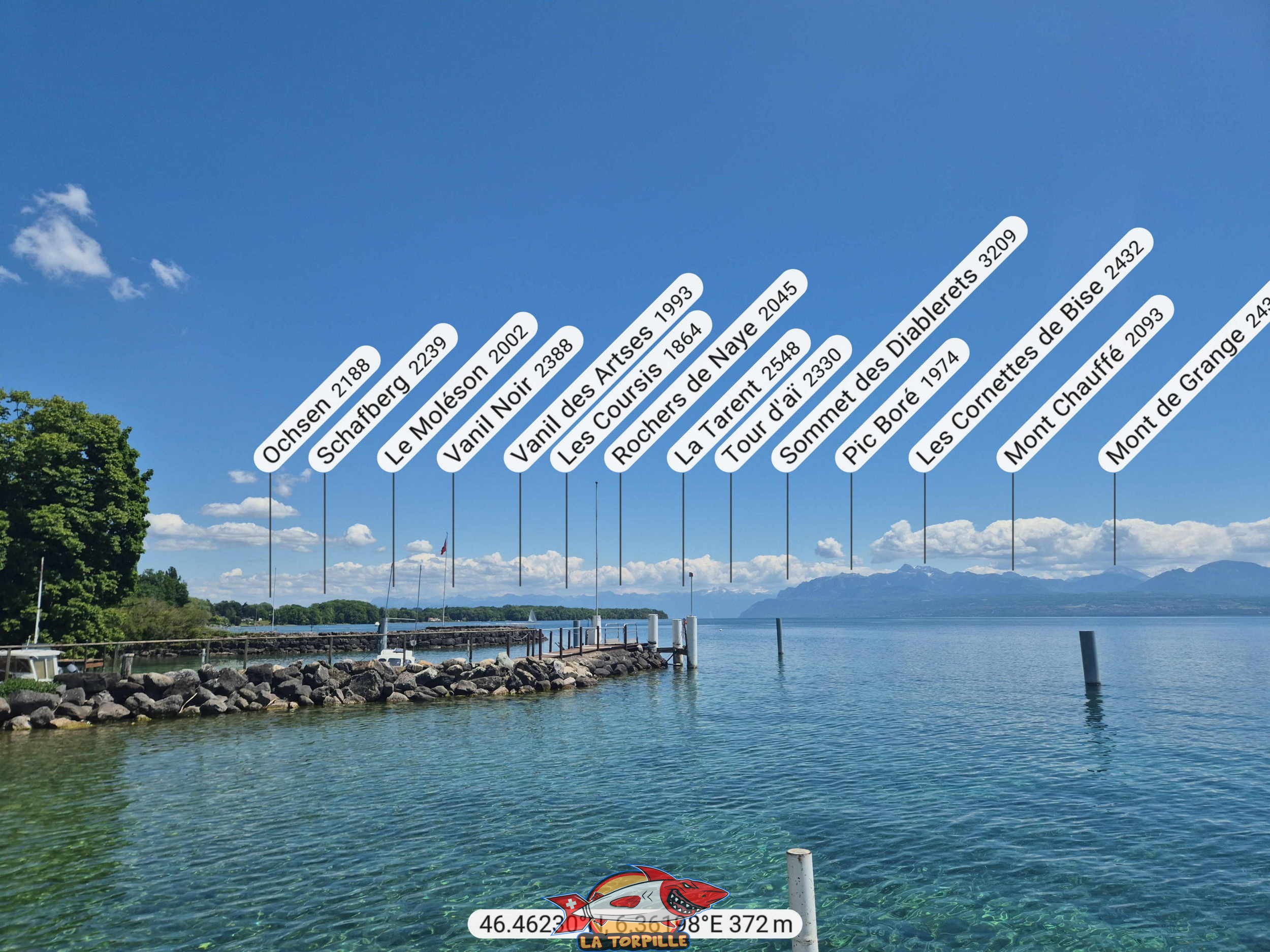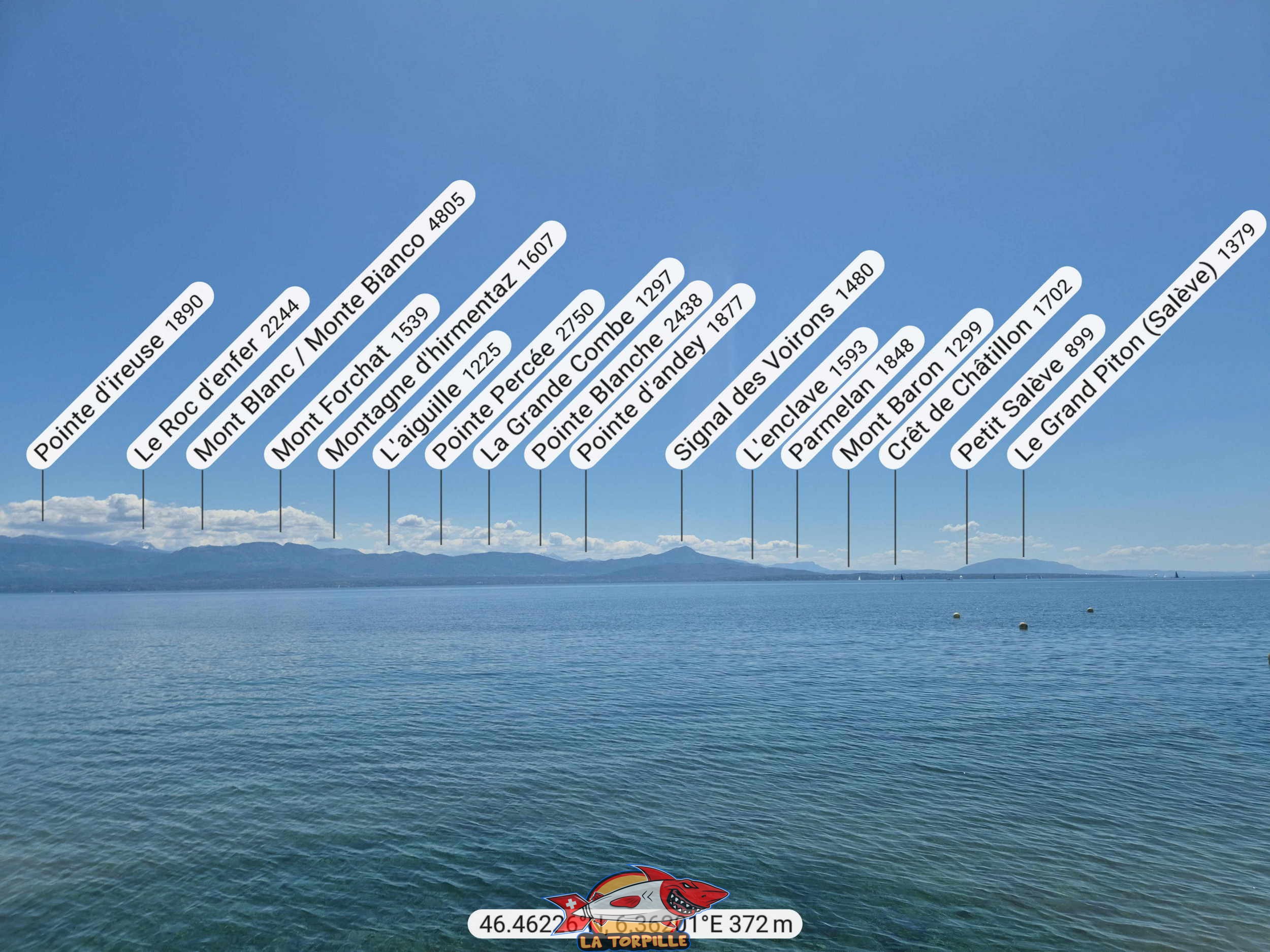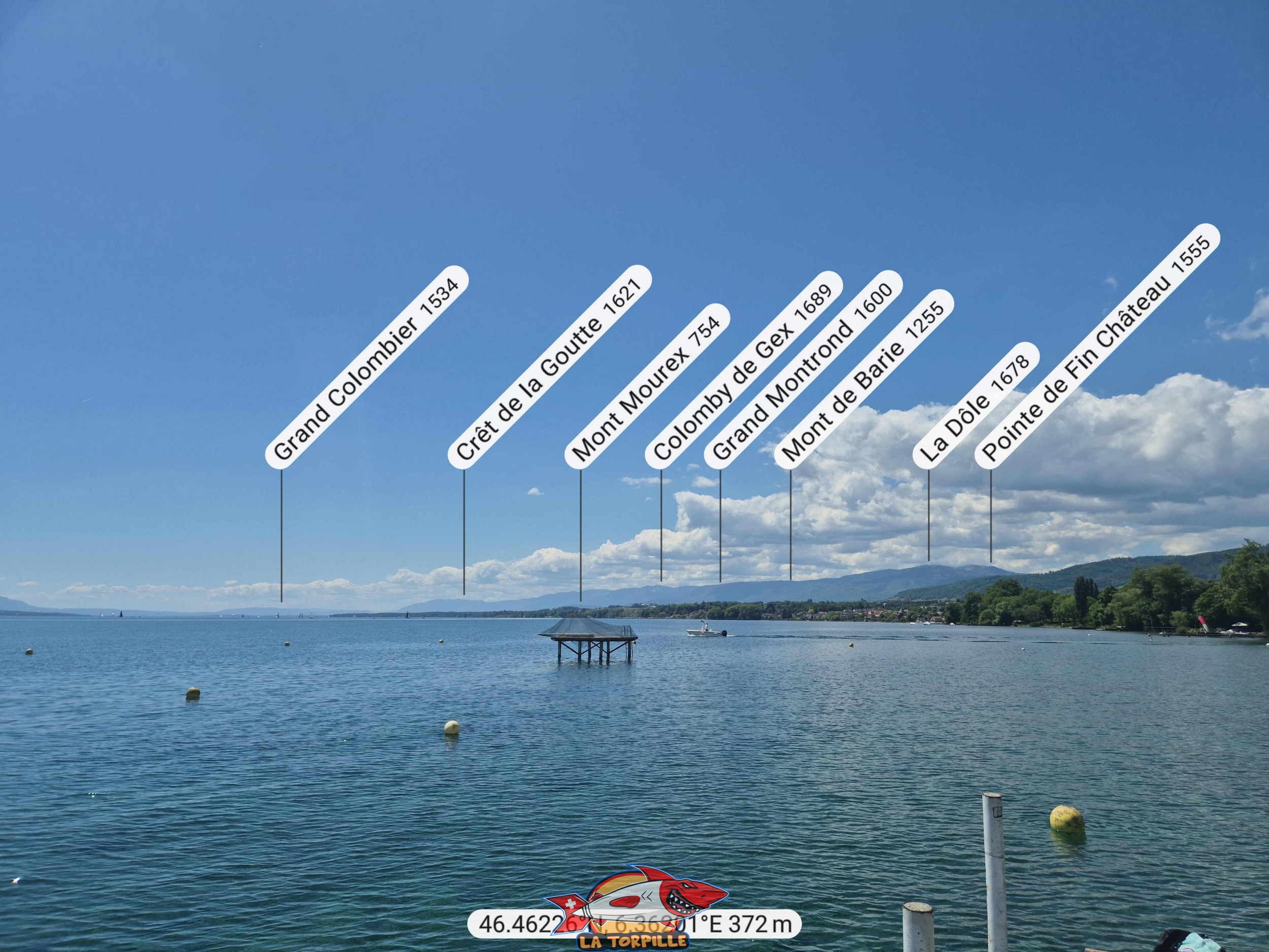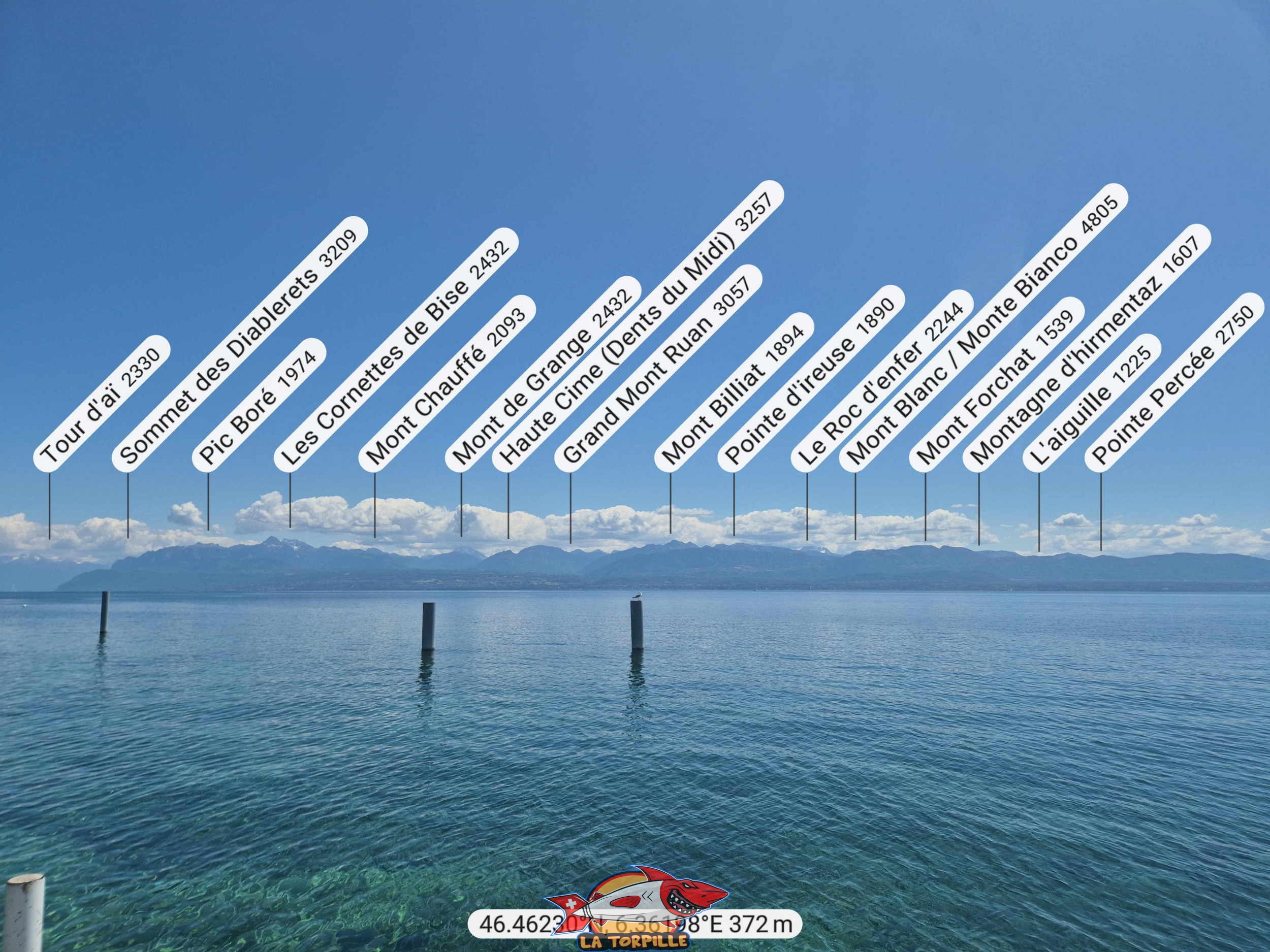 La vue direction Sud-Est depuis la plage du Plongeon à Perroy. Les Diablerets, les Cornettes de Bise, les Dents du Midi, le Mont Blanc.