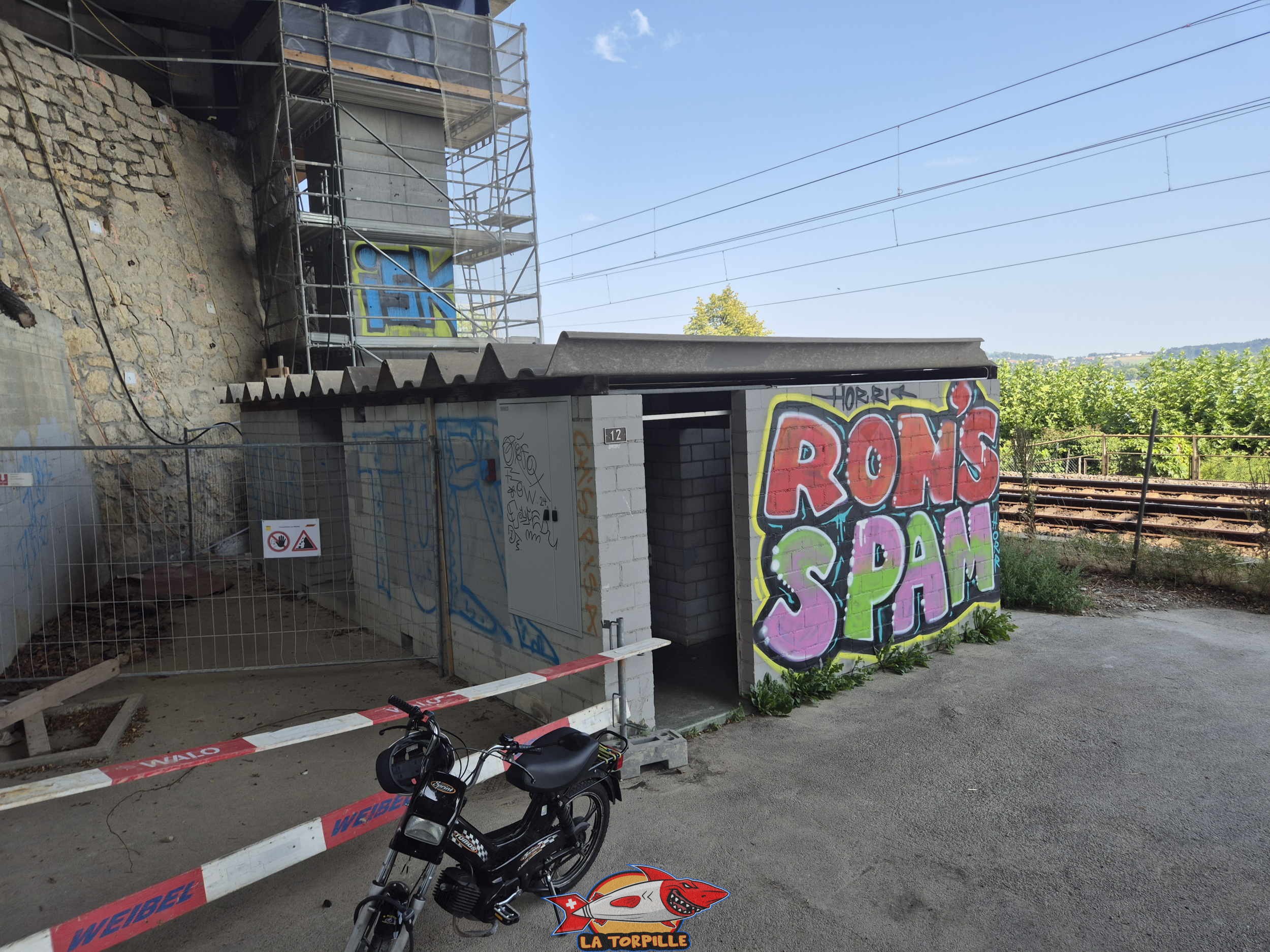 Le bâtiment des toilettes au niveau de la voie du chemin de fer.