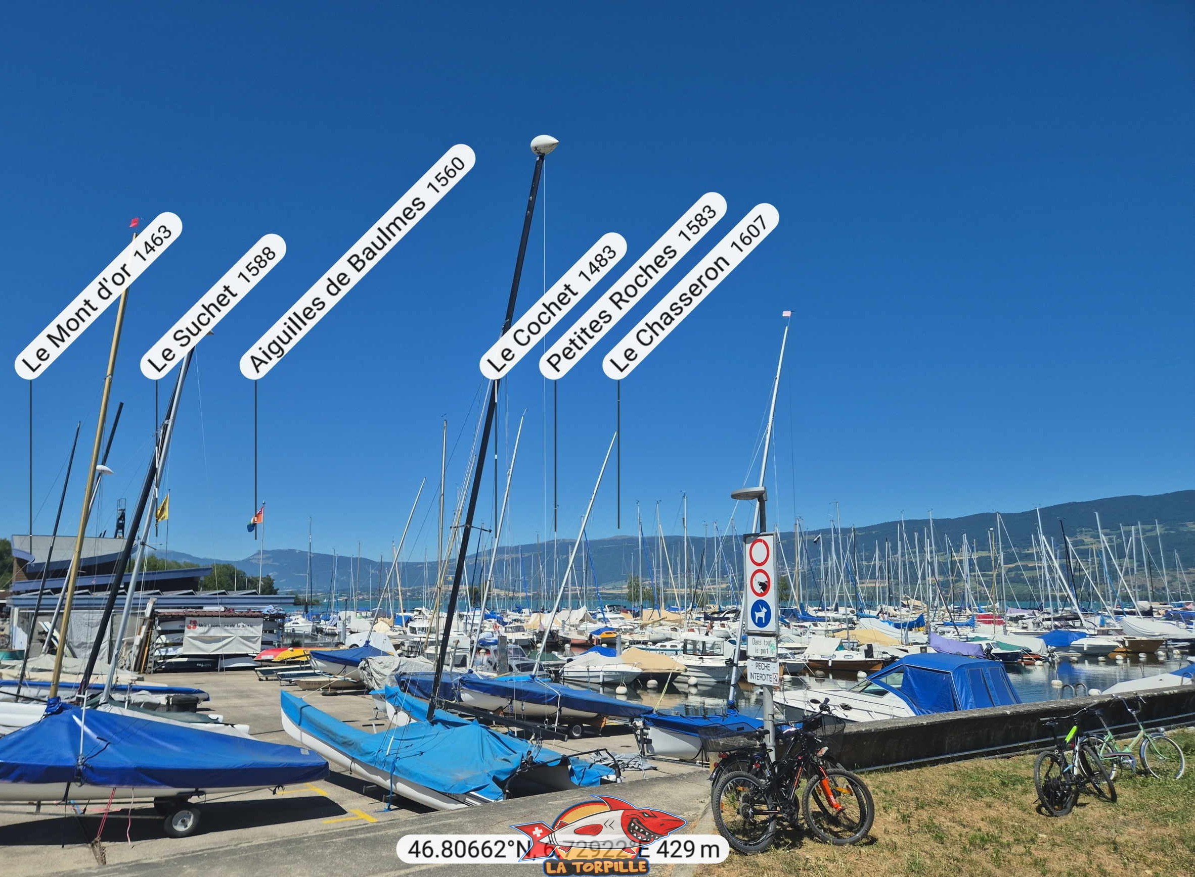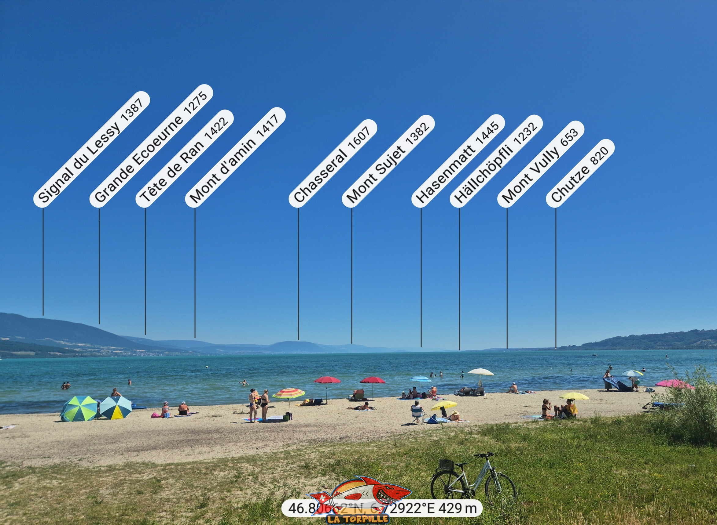 Le panorama, direction nord-est, depuis la plage du port d’Yvonand. Tête de Ran, le Chasseral, Mont Vully.