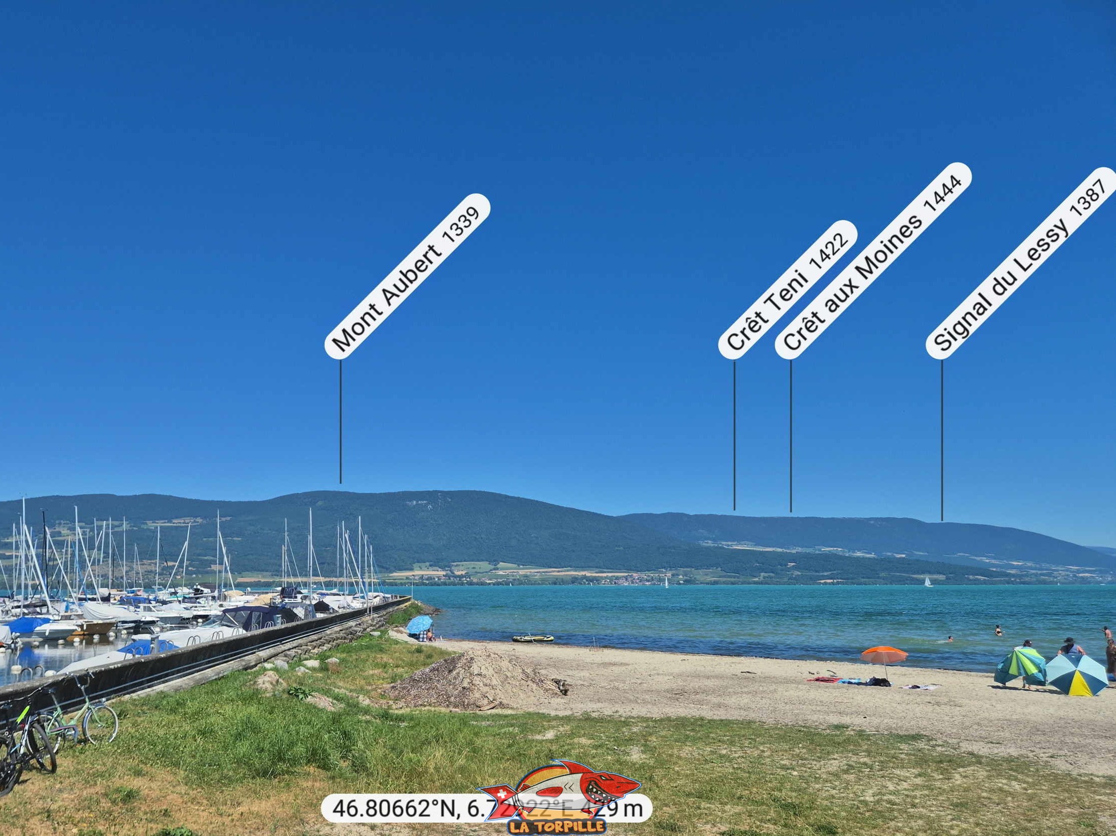 Le panorama, direction nord, depuis la plage du port d’Yvonand. Mont Aubert, Crêt Teni et Crêt aux Moines.
