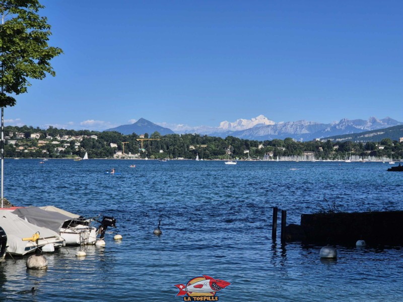 Le panorama, direction sud-est, depuis la plage Nautica. Le Mont Blanc.