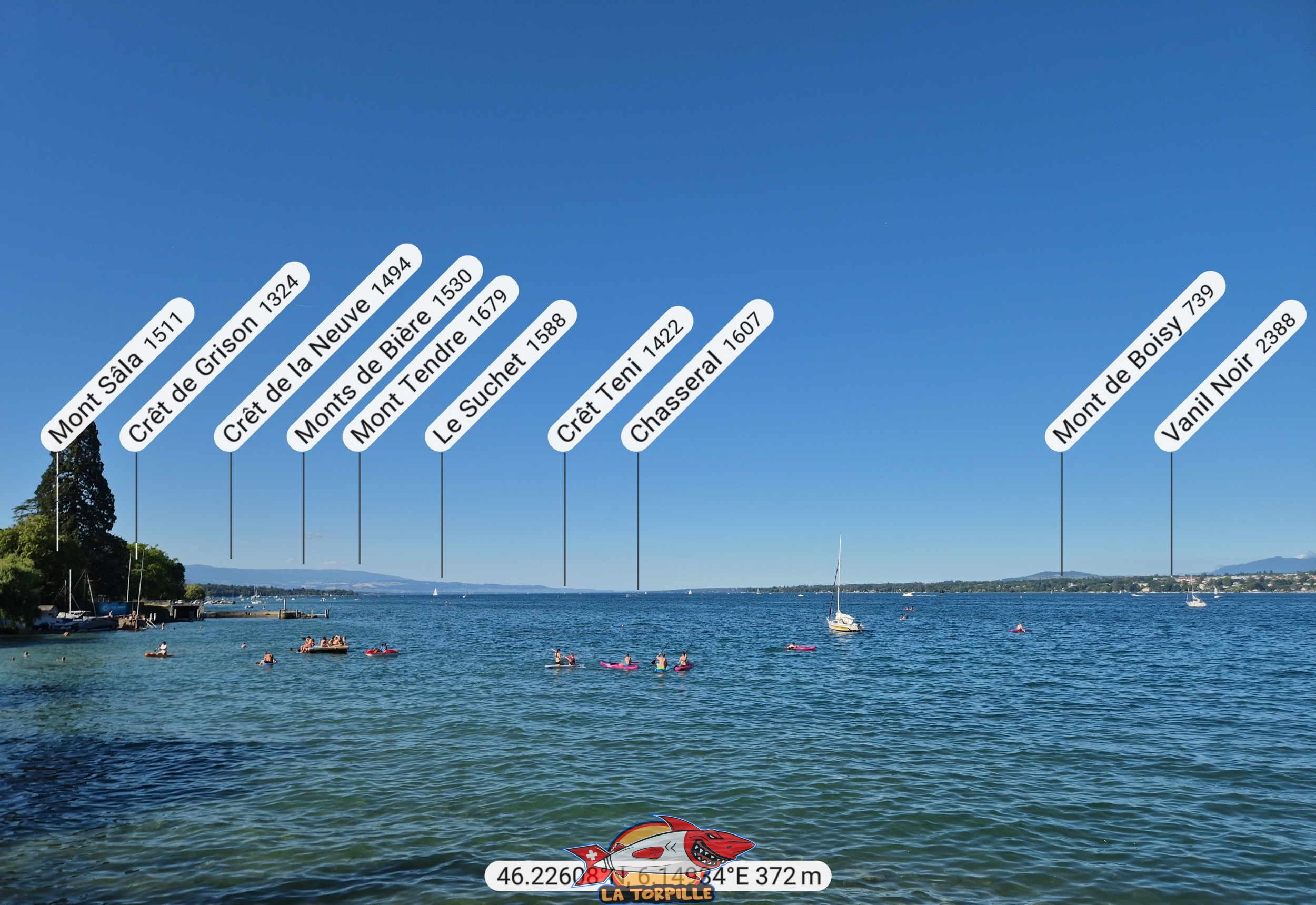 Le panorama, direction est, depuis la plage Nautica. Le Signal des Voirons, Le Pralère, Le Môle.