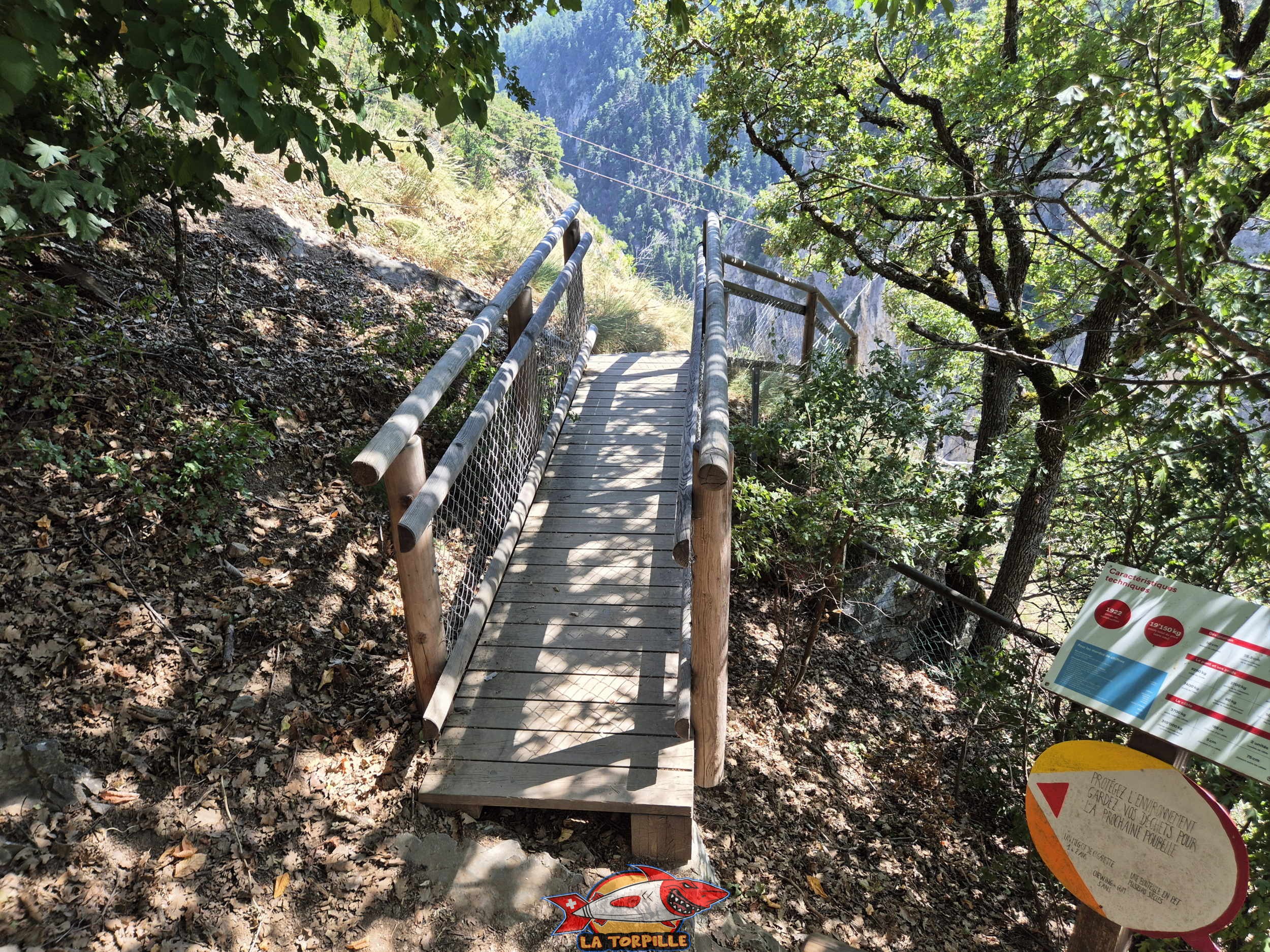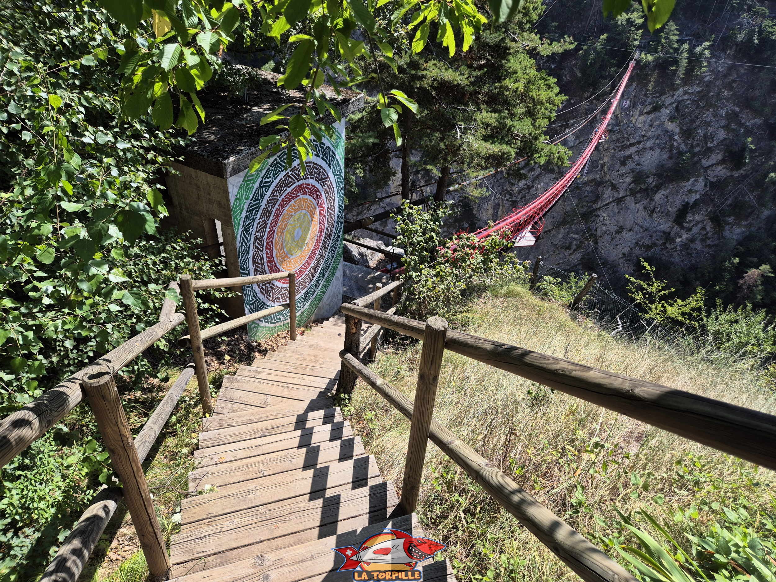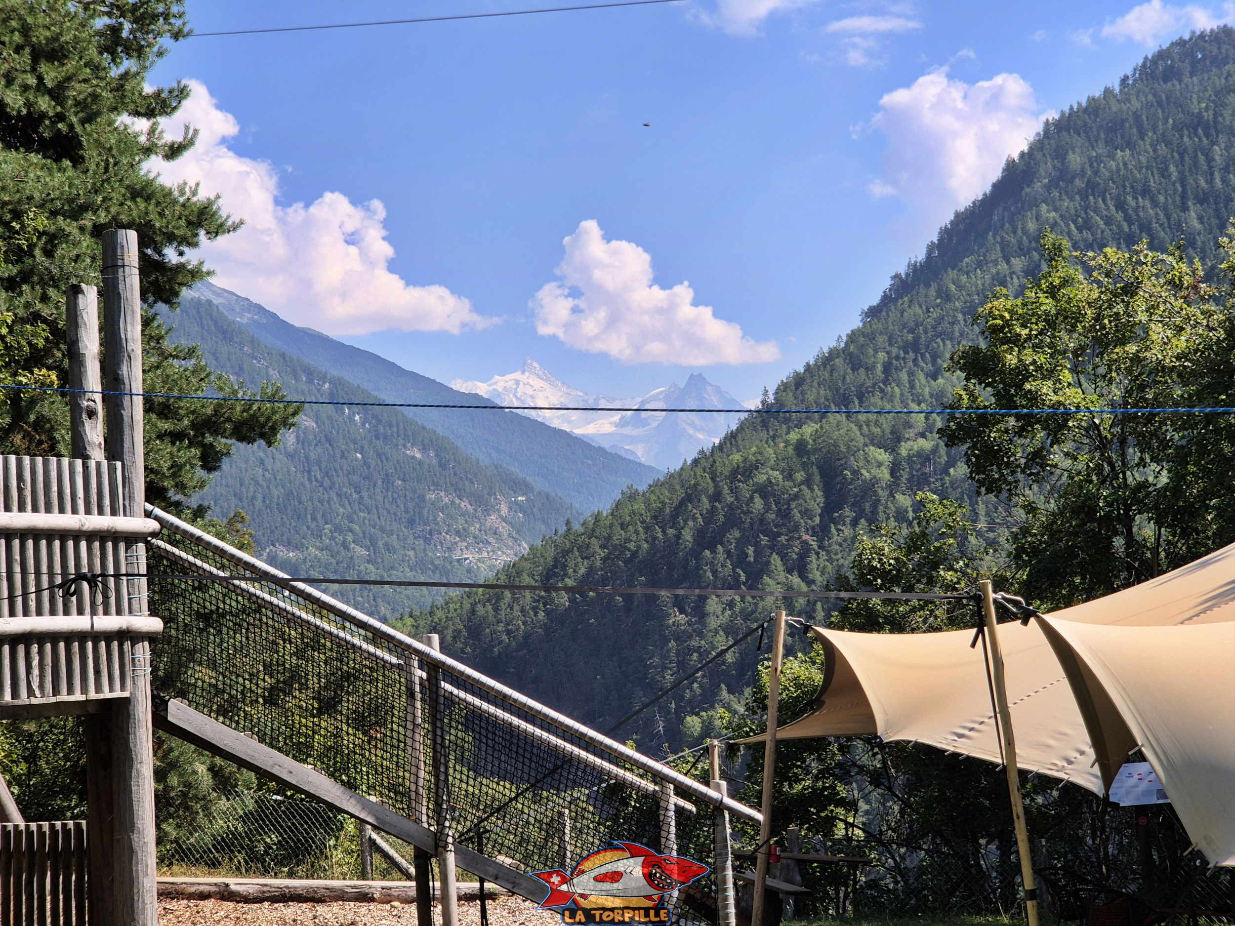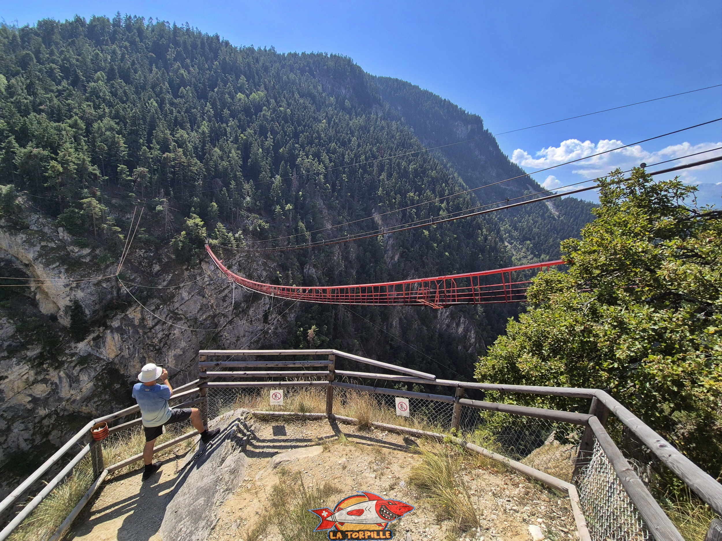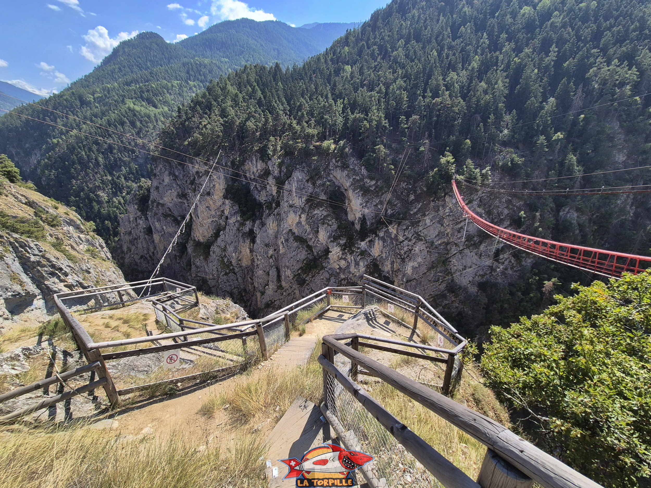 La vue sur la passerelle depuis la zone d’arrivée de la tyrolienne.