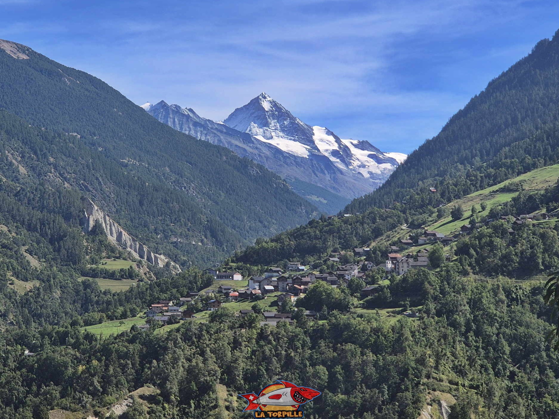 Les vues éloignées sur les Pyramides et le haut du val d’Hérens avec la Dent Blanche. Ce sommet se trouve dans les communes de trois vallées différentes. Evolène, Anniviers et Zermatt.